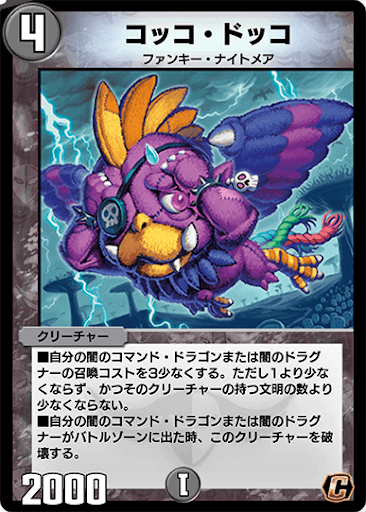 闇のコマンド・ドラゴン、または闇のドラグナーの召喚コストを大幅に軽減するサポーター。マナカーブ通りの動きをした場合は、《コッコ・ドッコ》を出した次のターン、最大8コストのクリーチャー《永遠の悪魔龍 デッド・リュウセイ》へスムーズに繋がる。