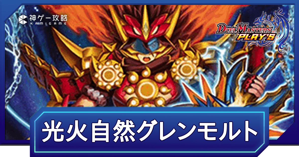 『デュエプレ(デュエマプレイス)』のNew Divisionにおける|光火自然グレンモルト(リースグレンモルト)デッキのレシピと回し方を紹介。キーカードとなるカードの紹介やデッキの特徴、序盤〜終盤までのデッキの回し方、マスター/レジェンド到達デッキ、デッキコードについて紹介しているため、ぜひ参考にどうぞ。