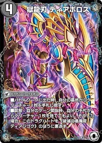 | ■W・ブレイカー ■攻撃する時、自分の山札の上から1枚目を墓地に置く。その後、そのターン、相手のクリーチャー1体のパワーを、自分の墓地にある闇のカード1枚につき-1000する。 (龍解前:《破滅の悪魔龍 ディアジゴク》) |