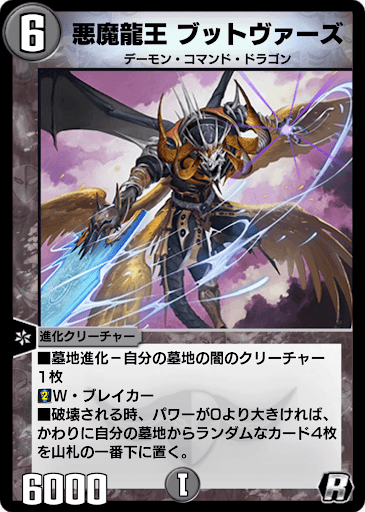 | ■墓地進化-自分の墓地の闇のクリーチャー1体 ■W・ブレイカー ■破壊される時、パワーが0より大きければ、かわりに自分の墓地からランダムなカード4枚を山札の一番下に置く。 |