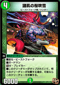 《諸肌の桜吹雪》は攻撃誘導能力を持つ、ブロッカーのような役割を持った進化獣だ。《諸肌の桜吹雪》がタップされてバトルゾーンに存在する限り、相手は《諸肌の桜吹雪》以外を攻撃できなくなるため、パワー6000未満のクリーチャーは実質攻め入ることができなくなる。