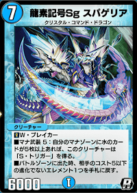 | ■W・ブレイカー ■マナ武装5:自分のマナゾーンに水のカードが5枚以上あれば、このクリーチャーは「S・トリガー」を得る。 ■バトルゾーンに出た時、相手のコスト5以下の進化でないエレメント1つを手札に戻す。 |