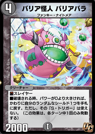 | ■スレイヤー ■破壊される時、パワーが0より大きければ、かわりに自分のランダムなシールド1つを手札に戻す。ただし、その「S・トリガー」は使えない。(この効果は、各ターン中1回のみ発動する) |