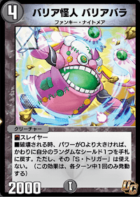 『デュエプレ(デュエマプレイス)』の「バリア怪人 バリアバラ」の評価と採用デッキについて紹介。カードの効果や特徴、生成・分解コスト、関連カードなども掲載しているため、カード生成の参考にどうぞ。