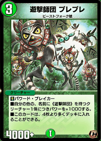 | ■パワード・ブレイカー ■自分の他の名前に《遊撃師団》を持つクリーチャー1体につきパワーを+1000する。 ■このカードは、4枚より多くデッキに入れることができる。 |