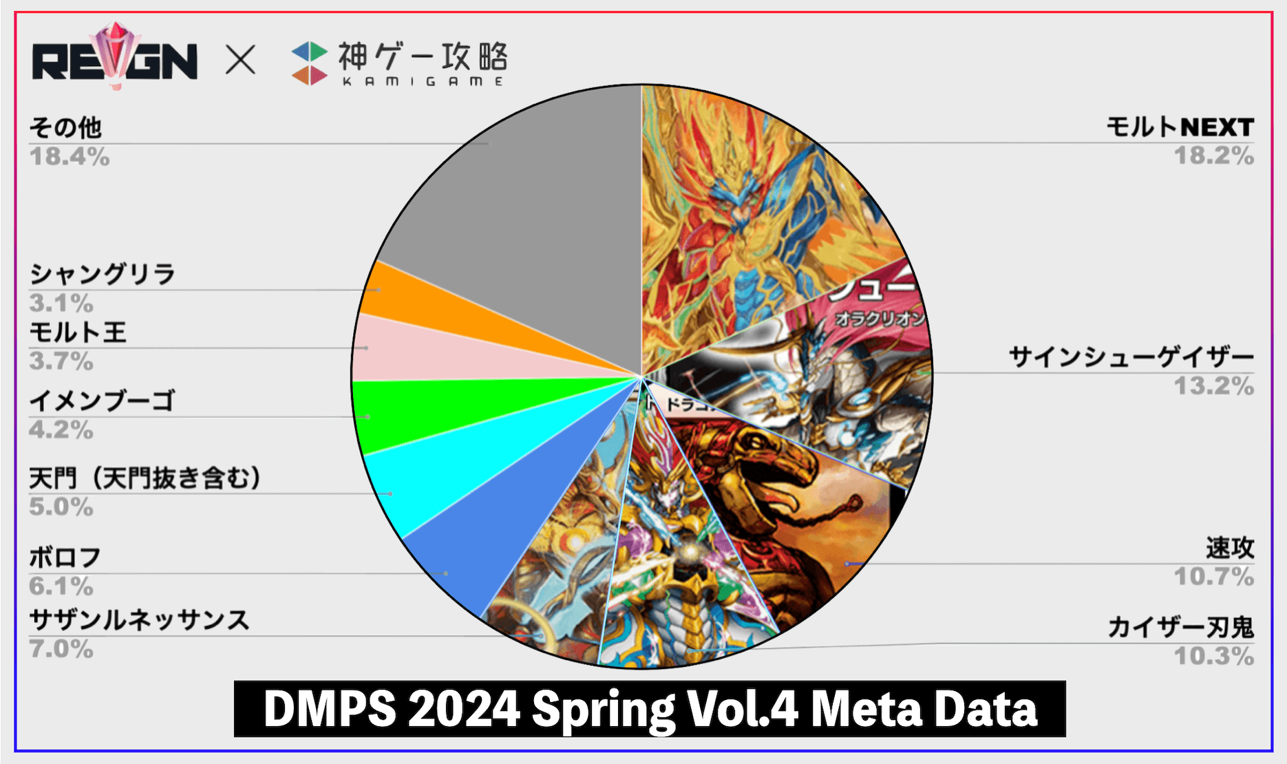 『デュエプレ(デュエマプレイス)』の2024年2月14日に開催された『REIGN DMPS VERTEX CUP 2024 Spring vol.4』の大会参加者デッキのメタデータを掲載。大会の優勝デッキや環境考察も掲載しているので、ぜひ参考にどうぞ。