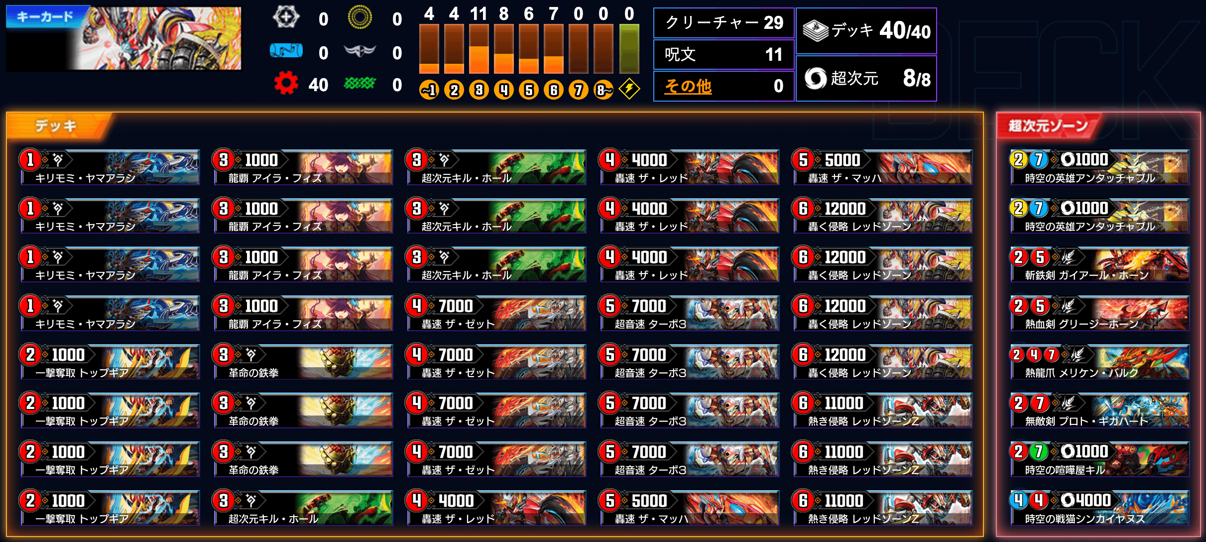 【関連カード】 【入れ替え候補】 -【用途】 《勝利のガイアール・カイザー》から《レッドゾーン》への侵略で、高い盤面制圧力を発揮。《サザン・ルネッサンス》の様に小型で盤面を形成してくる対面に刺さる他、《アンタッチャブル》の二面展開でコントロール対面にも有効。 |