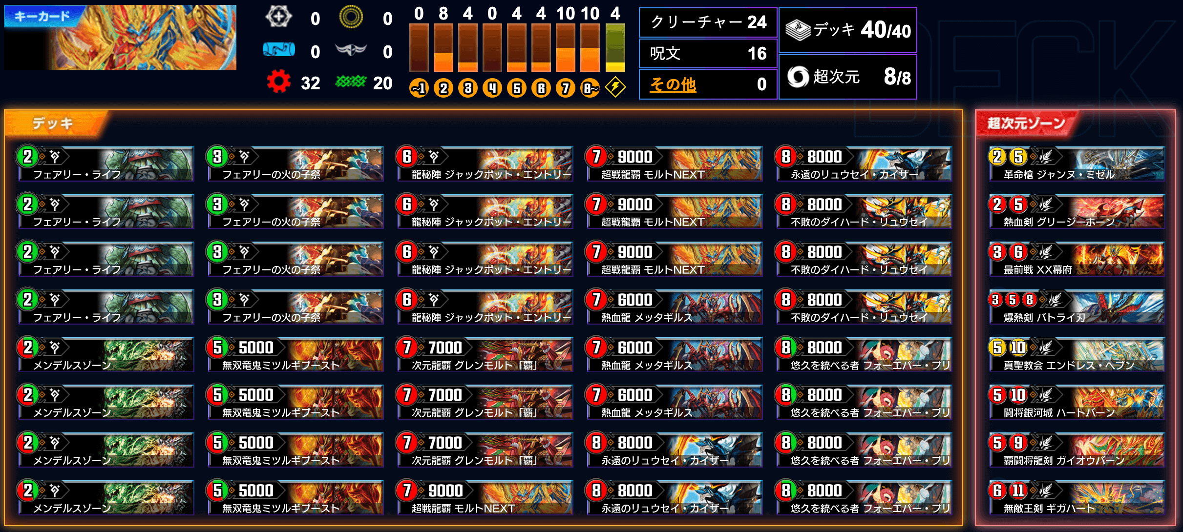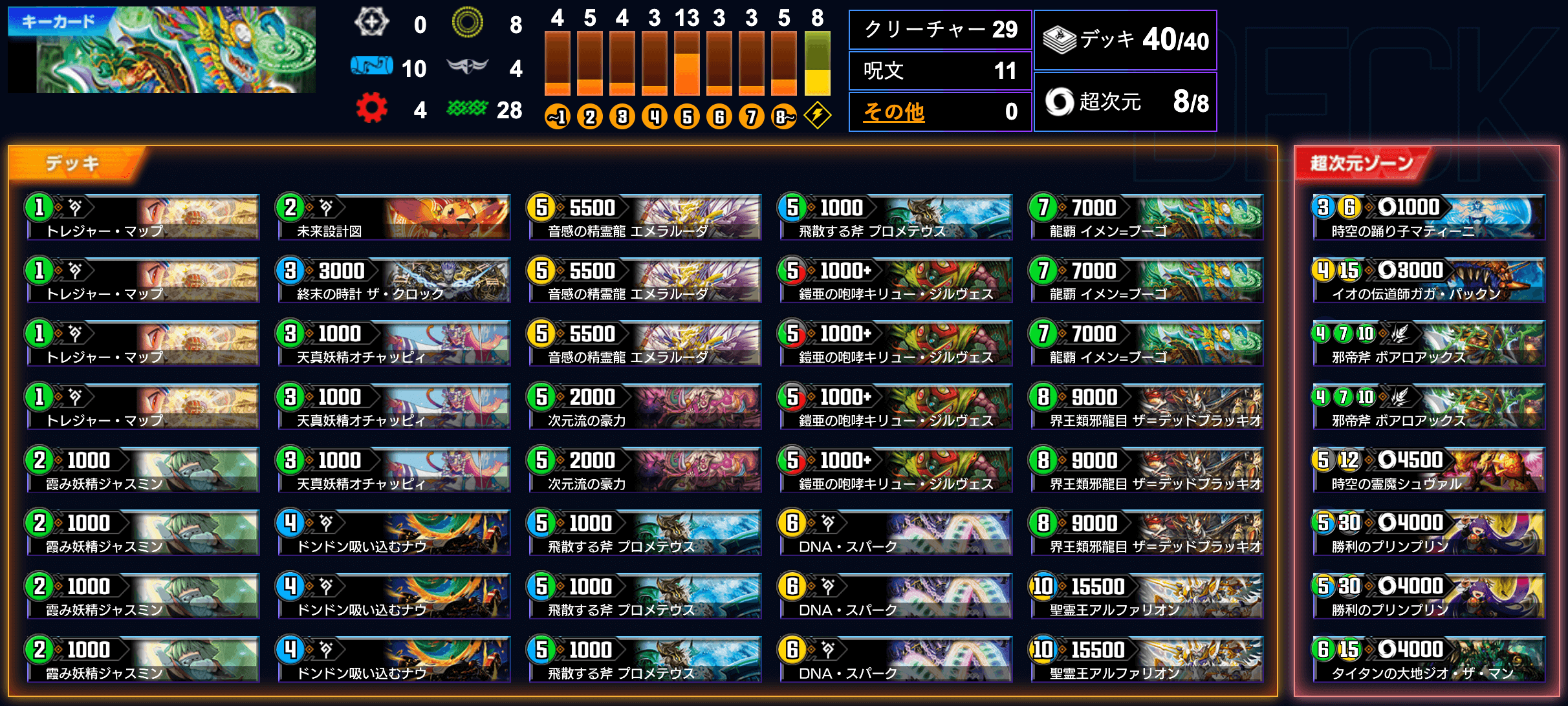 《サイレント・スパーク》のスタン落ちによってデッキのマナ色バランスに苦しんでいた「イメンブーゴ」だが、前週から徐々に姿を見せ始め、今週は構築が固まってきている。「レッドゾーン」などの単純なビート対面には、《エメラルーダ》による耐久が強力に働き有利をつけやすく、「天門」などの耐久系のデッキには《アルファリオン》ルートを取れるなど、今環境でも非常に万能感が高いデッキだ。