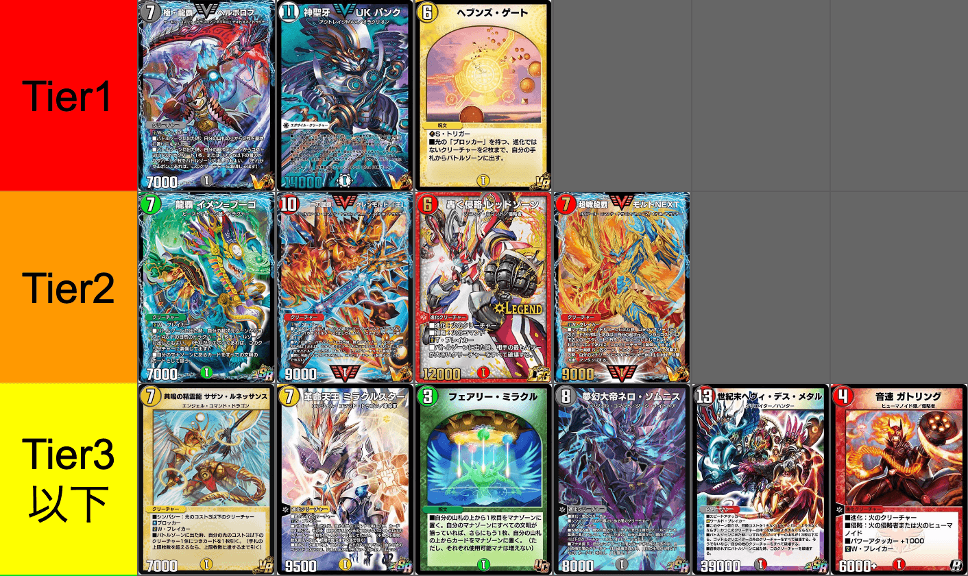 上記の通り、前環境ほど安定してデッキパワーを発揮しづらくなってはいる。とは言え、マナさえ溜まり切るとプレイヤースキルで上記2デッキに対してもやりようは出てくるため、Tier1評価をする方もいるだろう。