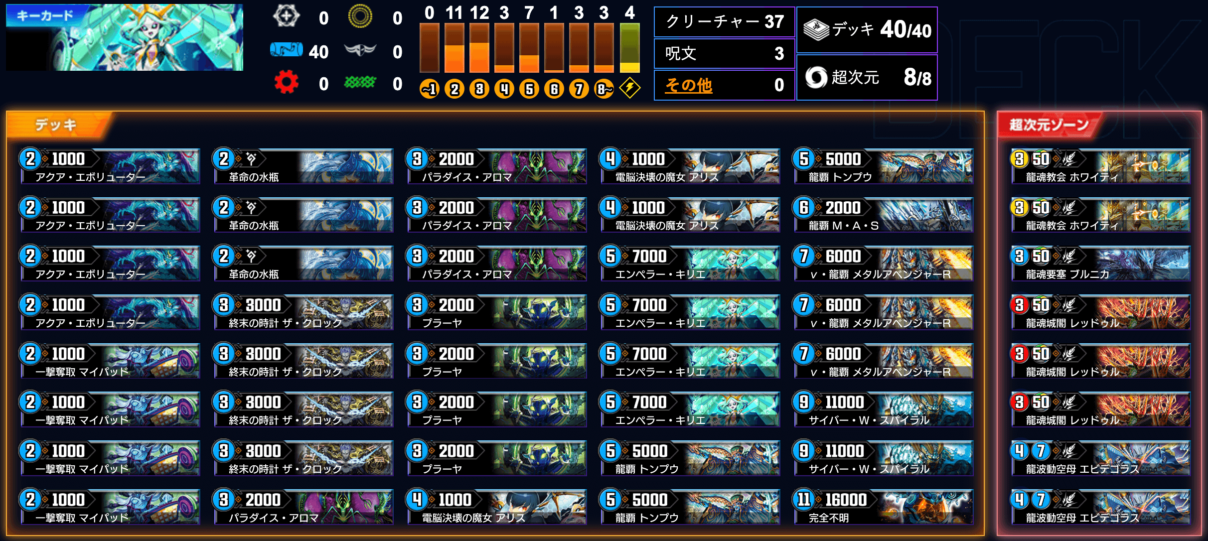 今の環境地味に厄介なのが、「サソリス」の《ユリア・マティーナ》や「デュエにゃん皇帝」のブロッカー軍団だ。「天門」も勿論だが、そういったブロッカーを《エビデゴラス》の龍解から無理矢理突破できるデッキとして、「水単キリエ」デッキが地味に使用率を上げていた。早期でのワンショット戦略もスムーズにでき、受けデッキを破壊するために出てきた「モルトNEXT」に有利をつける特徴を持つ。