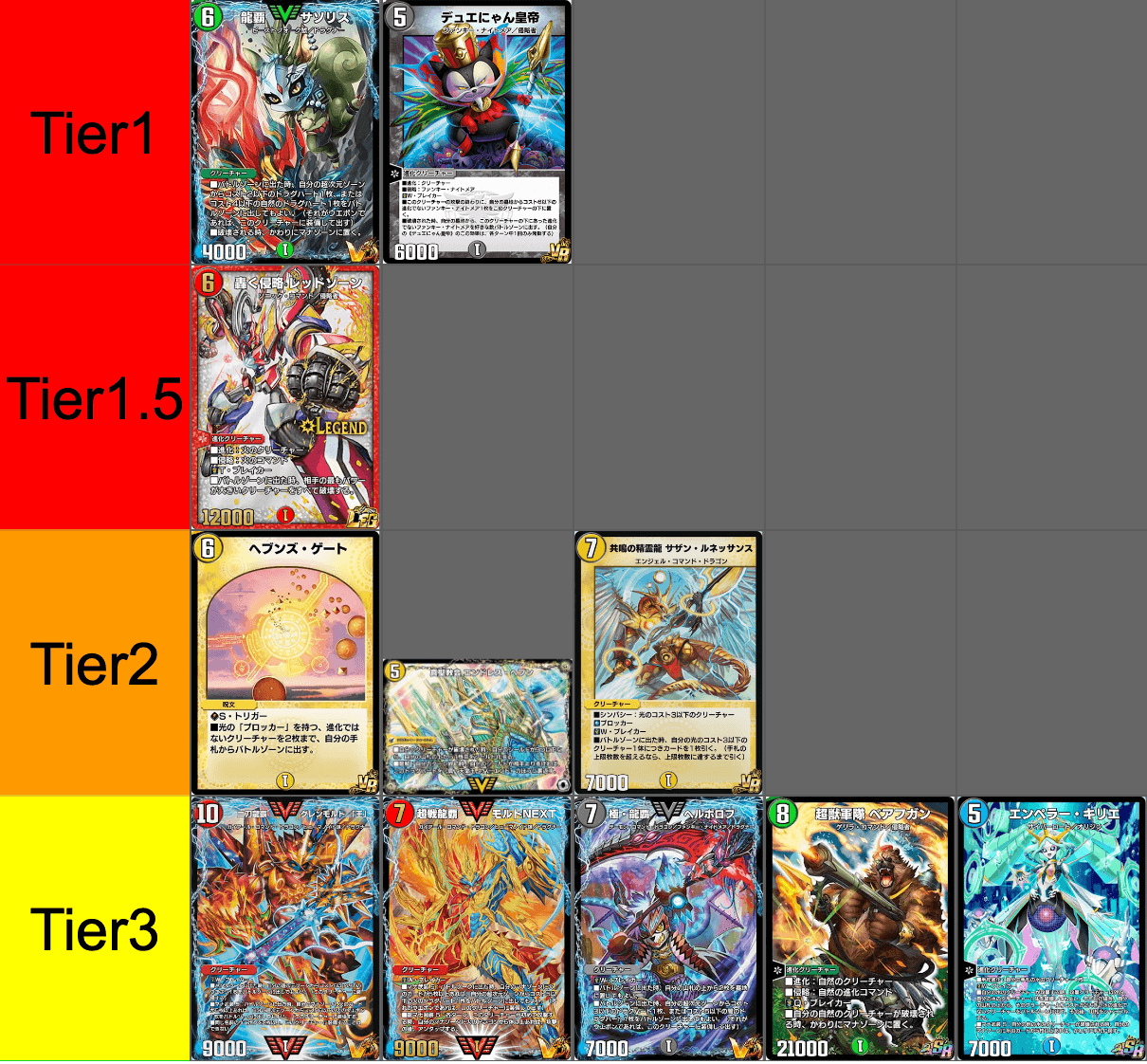 『デュエプレ(デュエマプレイス)』の2024年6月第4週(6月15日〜6月21日)環境考察を掲載。Tier表の解説や各種デッキの立ち位置、デッキの相性状況を記載しているので、ぜひご参考にどうぞ。