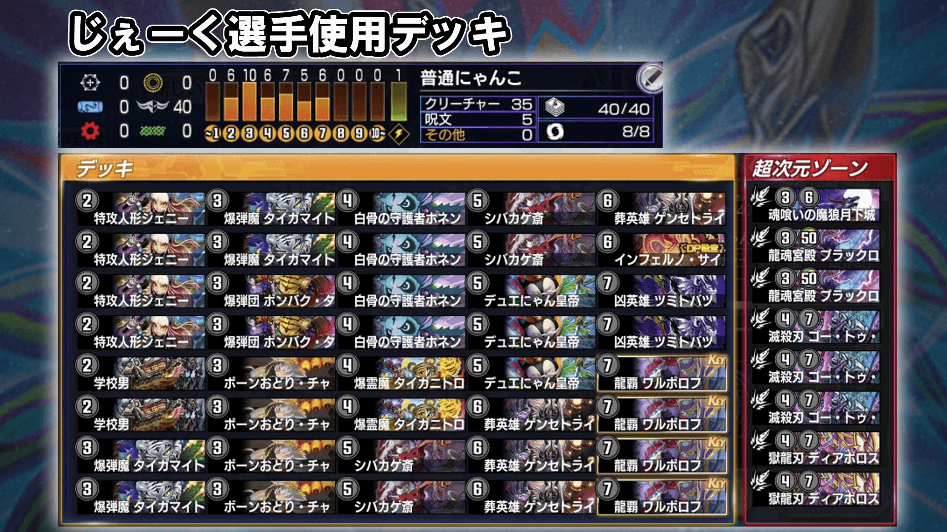 | 今回の大会では、黒単デュエにゃん皇帝を使用したんですけど、キーカードとしては《凶英雄 ツミトバツ》というカードを入れて大会に臨みました。 ポイントとしては皇帝の弱点である横並びを完全にカバーしてくれるのと、ミラーに対しても形成逆転を狙えるカードという認識で使用しました。 |