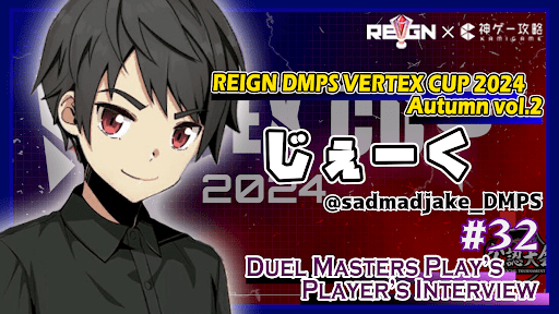 今回はデュエルマスターズプレイスの公認大会「REIGN DMPS VERTEX CUP 2024 Autumn vol.2」で優勝したプレイヤー「じぇーく」選手にインタビューを実施!印象的な試合や普段のプレイングについて聞いたので参考にどうぞ!