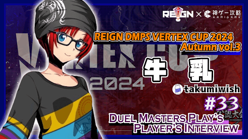 今回はデュエルマスターズプレイスの公認大会「REIGN DMPS VERTEX CUP 2024 Autumn vol.3」で優勝したプレイヤー「牛乳」選手にインタビューを実施!印象的な試合や普段のプレイングについて聞いたので参考にどうぞ!