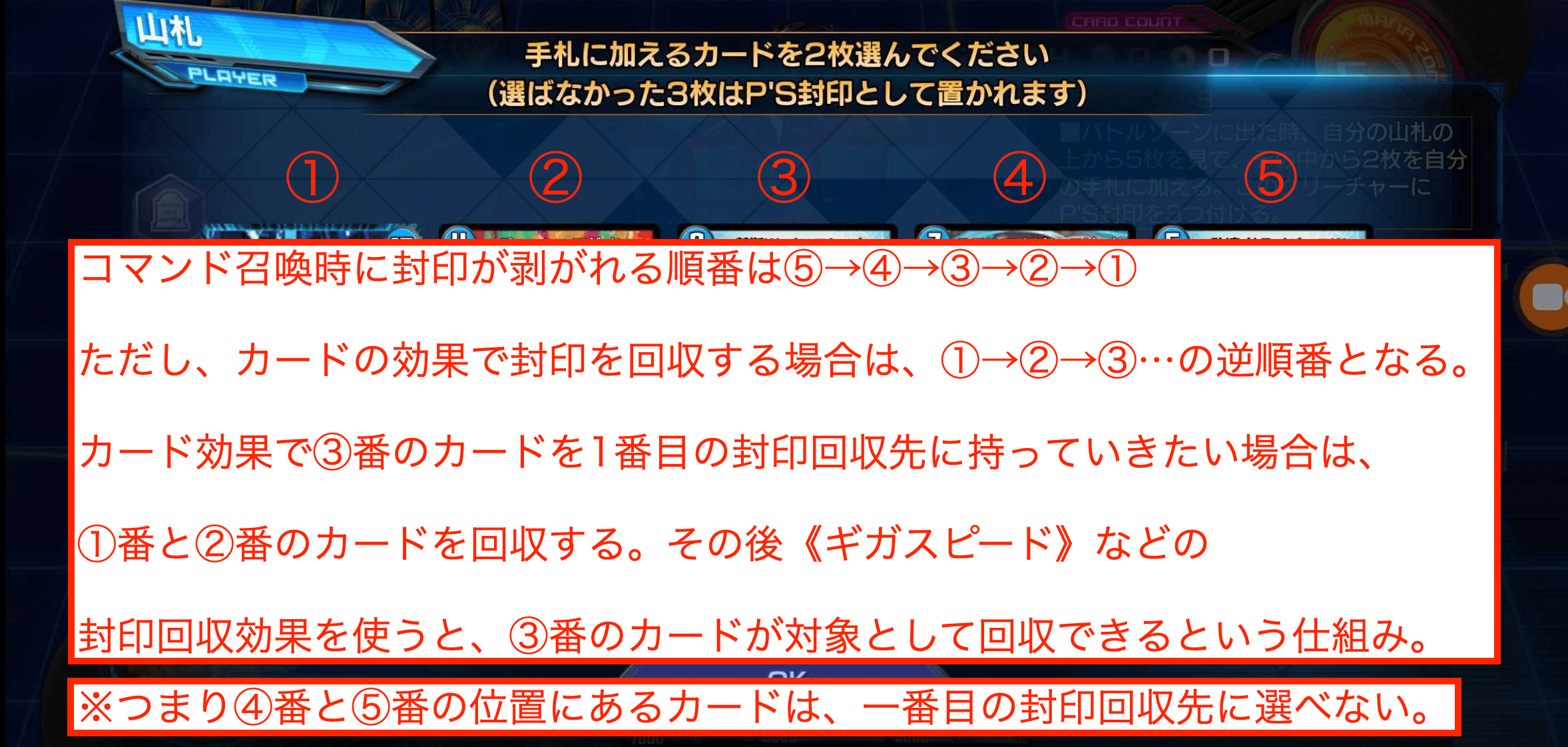 また、手札リソースの回復する効果も持ち、後続ターンで封印を剥がすためのコマンドリソースを手札に引き込める。