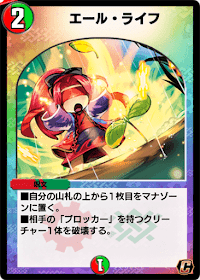 《エール・ライフ》は、《フェアリー・ライフ》などと同様、2コストのマナ加速初動枠として活躍する呪文の一枚だ。追加効果で相手のブロッカーを破壊する効果も持ち合わせている。