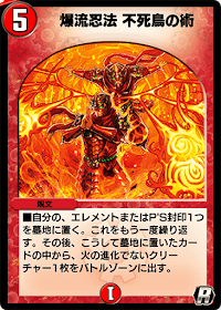 《爆流忍法 不死鳥の術》は、基本的には《ドキンダムX》の様な禁断クリーチャーの封印解除を加速させる目的で使用されるコンボ系の呪文だ。P'S封印の中に火文明の非進化獣がいた場合、バトルゾーンに踏み倒し、さらなる封印解除や登場時能力などの活用を狙える。