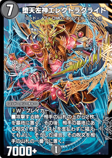 《堕天左神エレクトラグライド》は、《「黒幕」》の左側にG・リンクによってゲーム外から登場するゴッド・クリーチャーだ。攻撃時に相手の山札を2枚削りながら、さらには相手の墓地に落ちている呪文を1枚奪って、コストを支払わずに唱える踏み倒し効果を持つ。