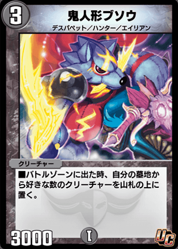 『デュエプレ(デュエマプレイス)』の「鬼人形ブソウ」の評価と採用デッキについて紹介。カードの効果や特徴、生成・分解コスト、関連カードなども掲載しているため、カード生成の参考にどうぞ。
