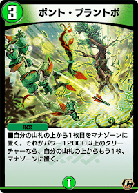 《ボント・プラントボ》は、デッキトップがパワー12000以上のクリーチャーだった場合、2マナ加速を行える初動呪文だ。パワー12000の大型獣を大量に採用したデッキ、つまりほぼグランセクト用の《龍の呼び声》とも言える呪文だが、増えたマナは即座に使用できるという違いがある。