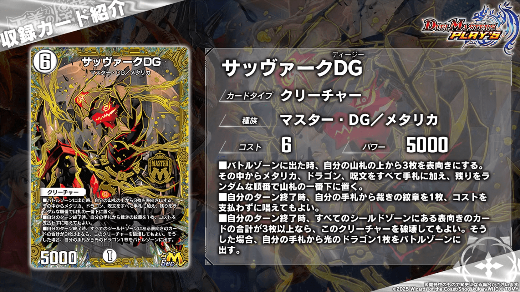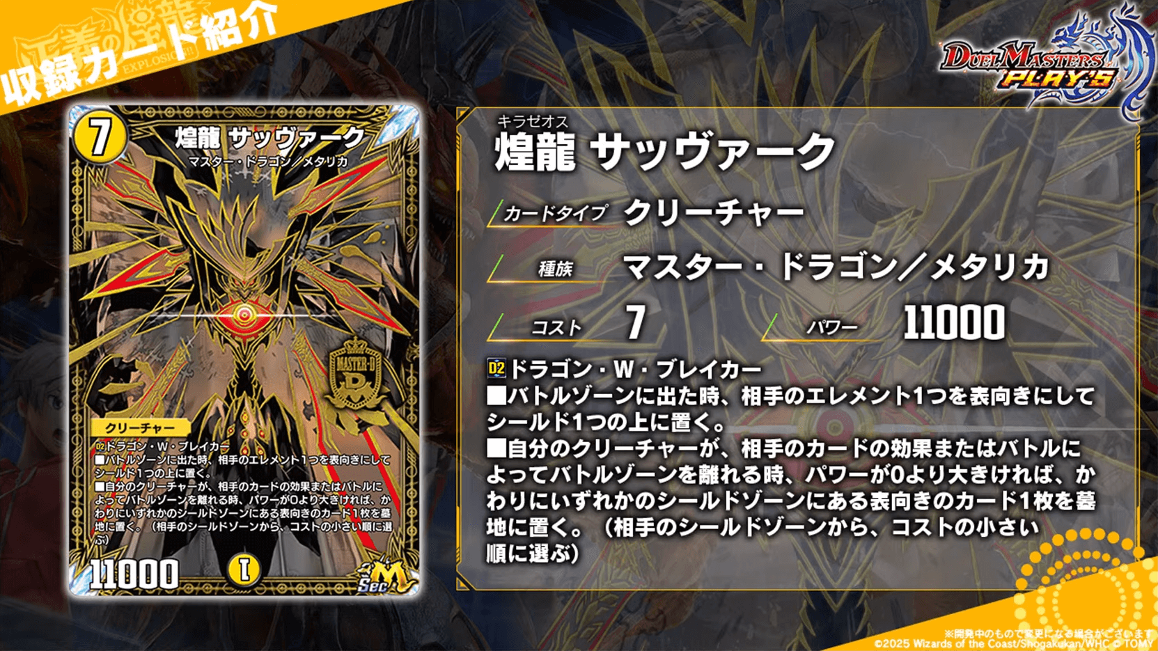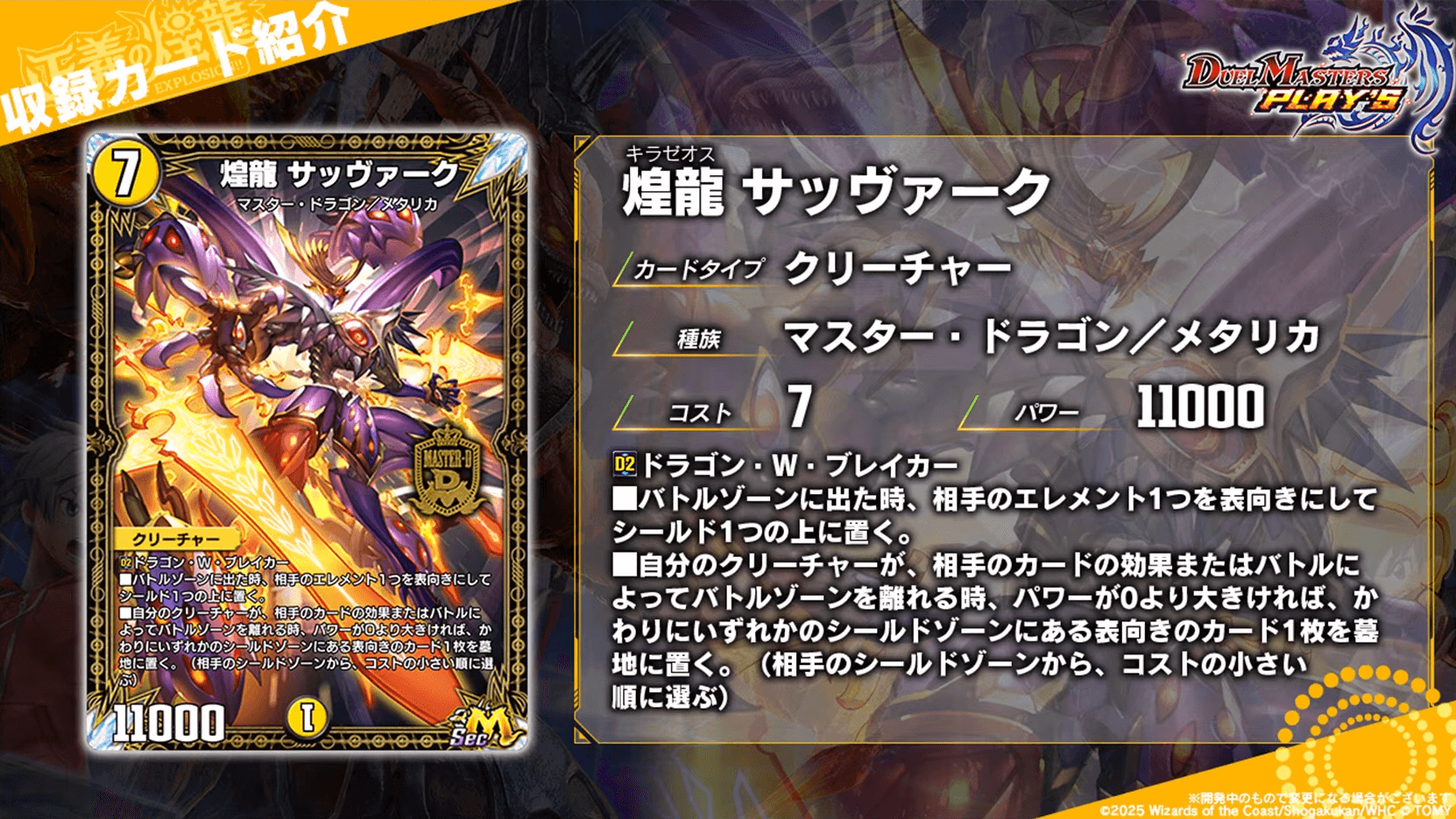レアリティ:Mカードタイプ:クリーチャーコスト:7パワー:11000文明:光種族:マスター・ドラゴンメタリカ効果テキスト|画像拡大 |