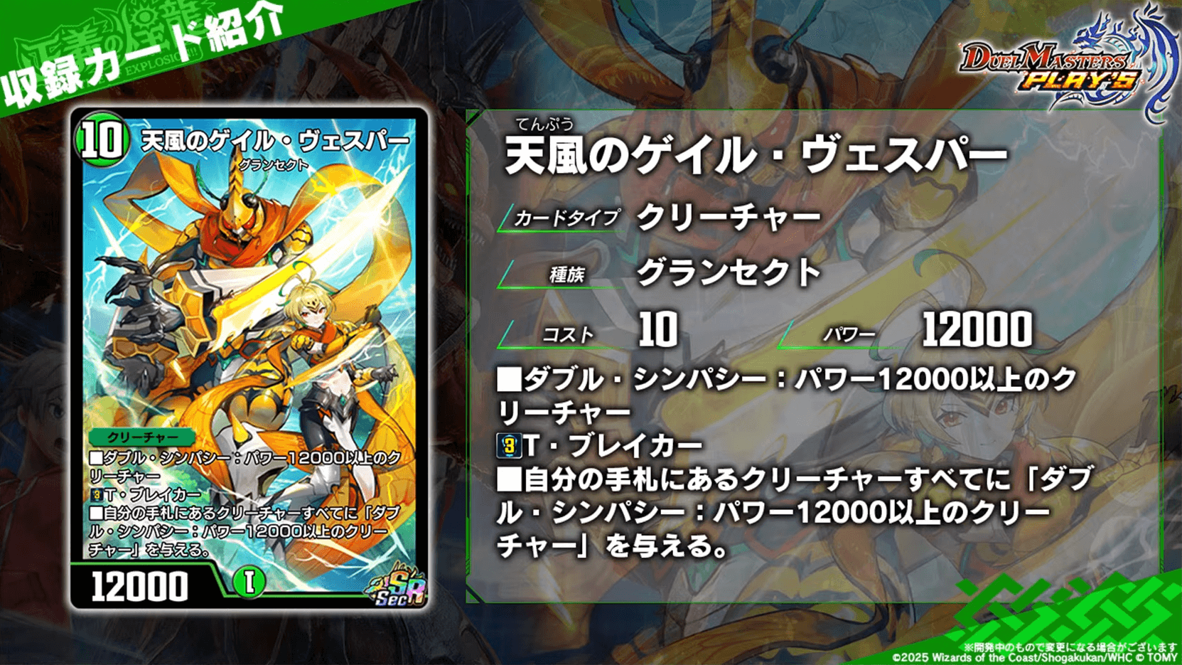 レアリティ:SRカードタイプ:クリーチャーコスト:6パワー:7000文明:光種族:メタリカ効果テキスト|画像拡大 |