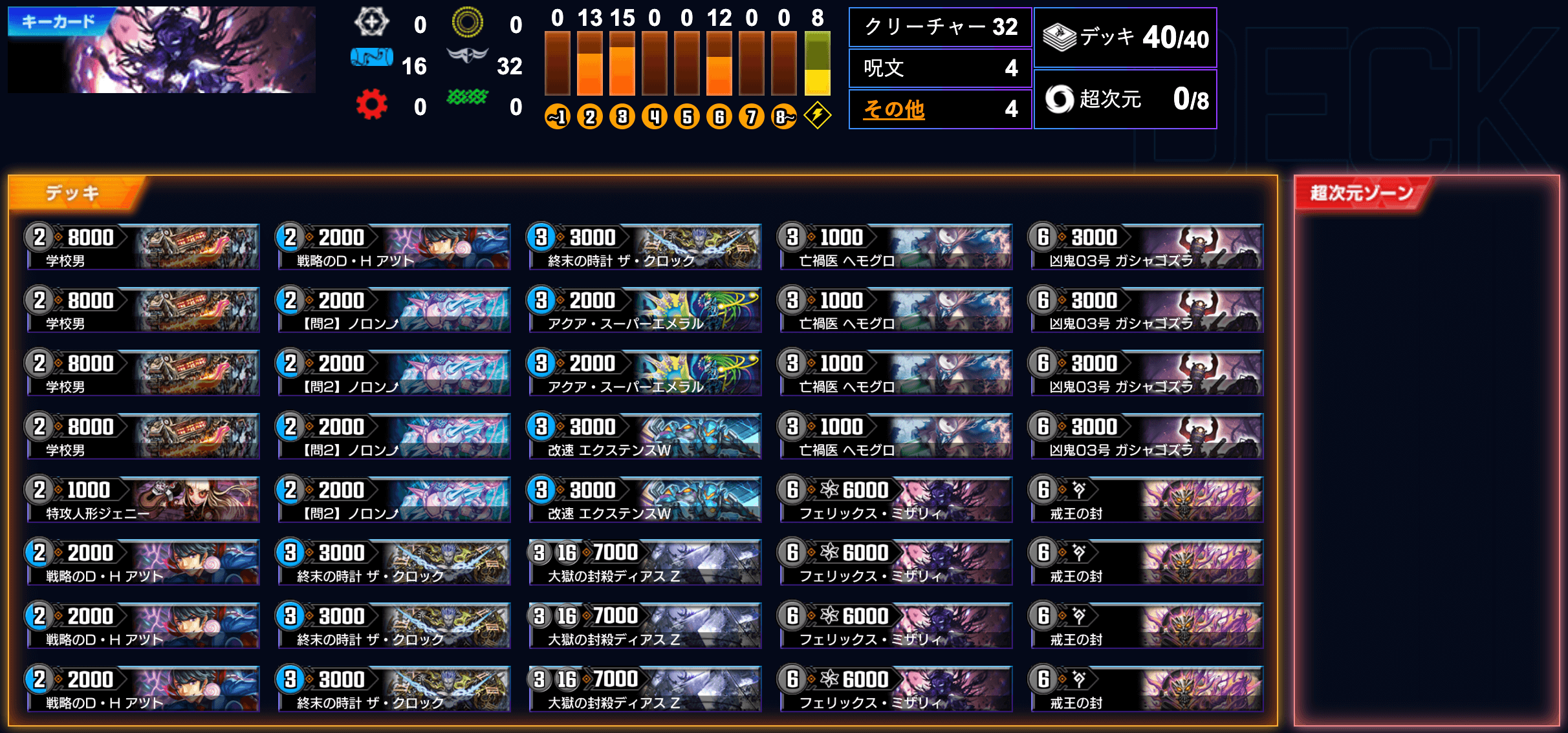 拡大《フェリックス・ミザリィ》《学校男》《ヘモグロ》の動きで、相手のリソースを最小限に抑えながら地道に攻めていくのが基本の動きとなる。対面によっては《ガシャゴズラ》で盤面を広げ、物量ビートで攻めていこう。