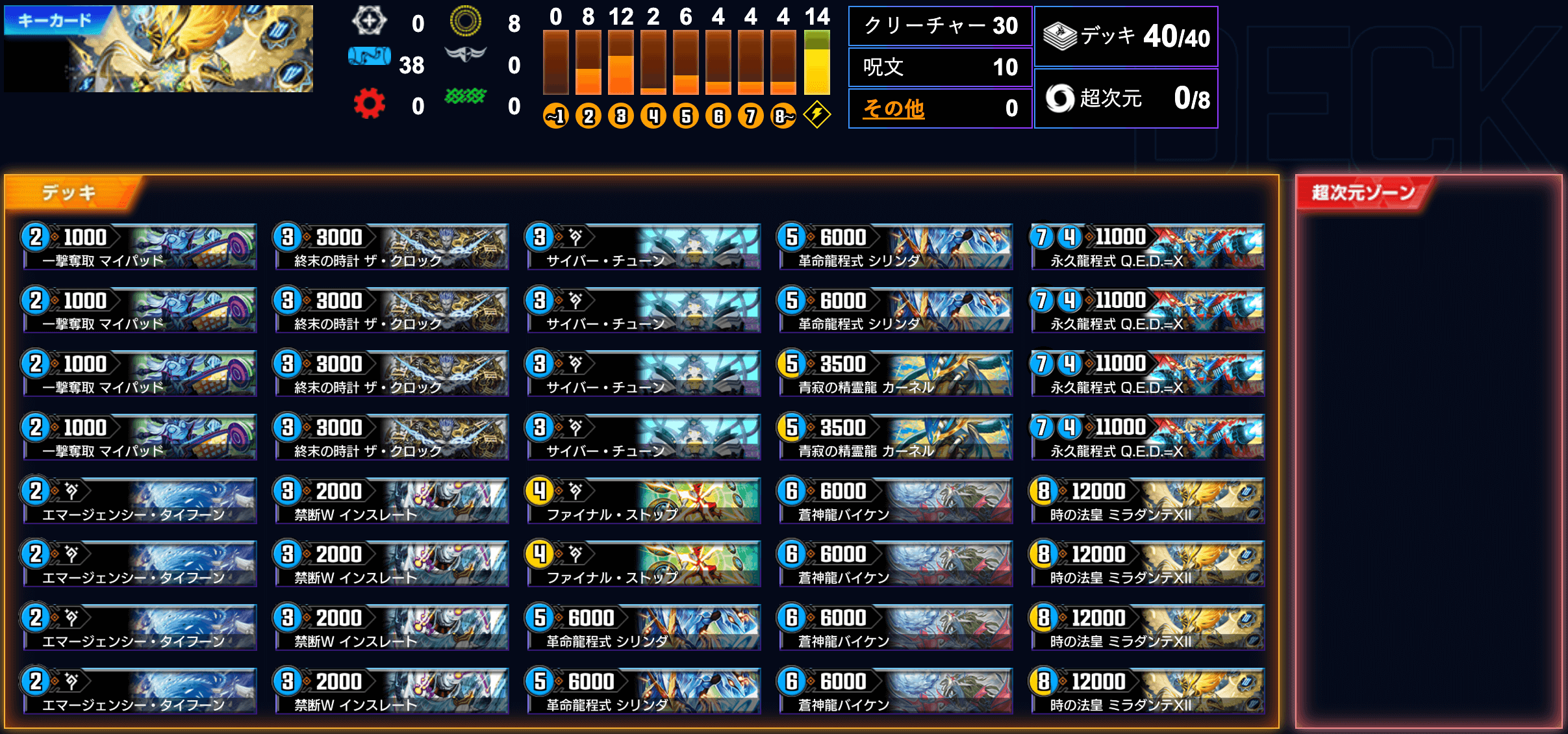 拡大《Q.E.D.=X》もしくは《シリンダ》による進化速攻から、《ミラダンテⅫ》への革命チェンジ。相手クリーチャーの召喚ロック効果と、 《ファイナル・ストップ》の踏み倒しによる呪文ロックを決め、相手のS・トリガーカウンターを封殺しながら攻めていく。
