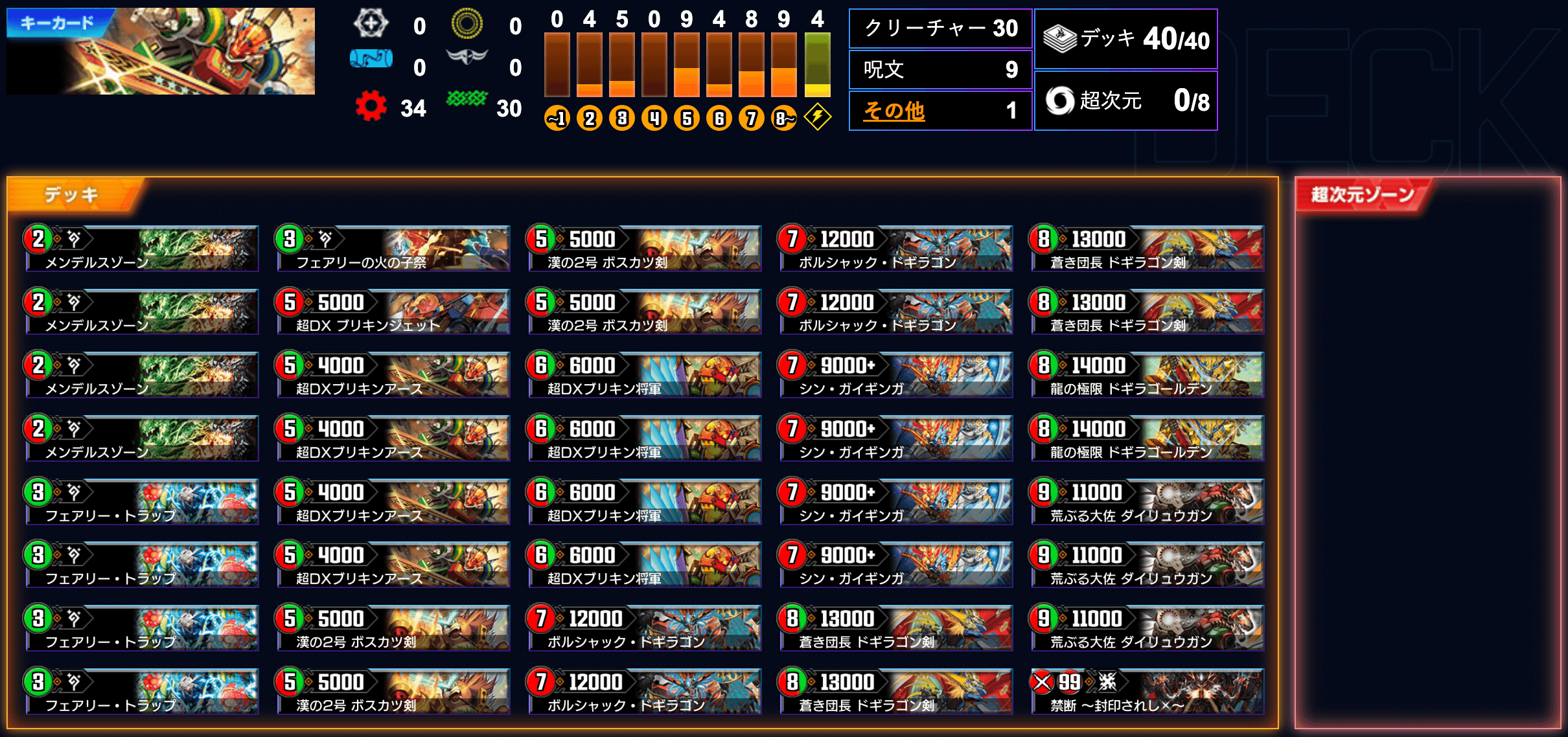 また、ドラゴン専用の強力なマナ加速呪文《メンデルスゾーン》なども採用され、「ドギラゴン剣」系デッキの中でもスピードと攻撃力は随一のものとなっている。