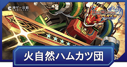 『デュエプレ(デュエマプレイス)』のAll Divisionにおける第32弾環境|火自然ハムカツ団デッキのレシピと回し方を紹介。キーカードとなるカードの紹介やデッキの特徴、序盤〜終盤までのデッキの回し方、マスター・レジェンド到達デッキ、デッキコードについて紹介しているため、ぜひ参考にどうぞ。