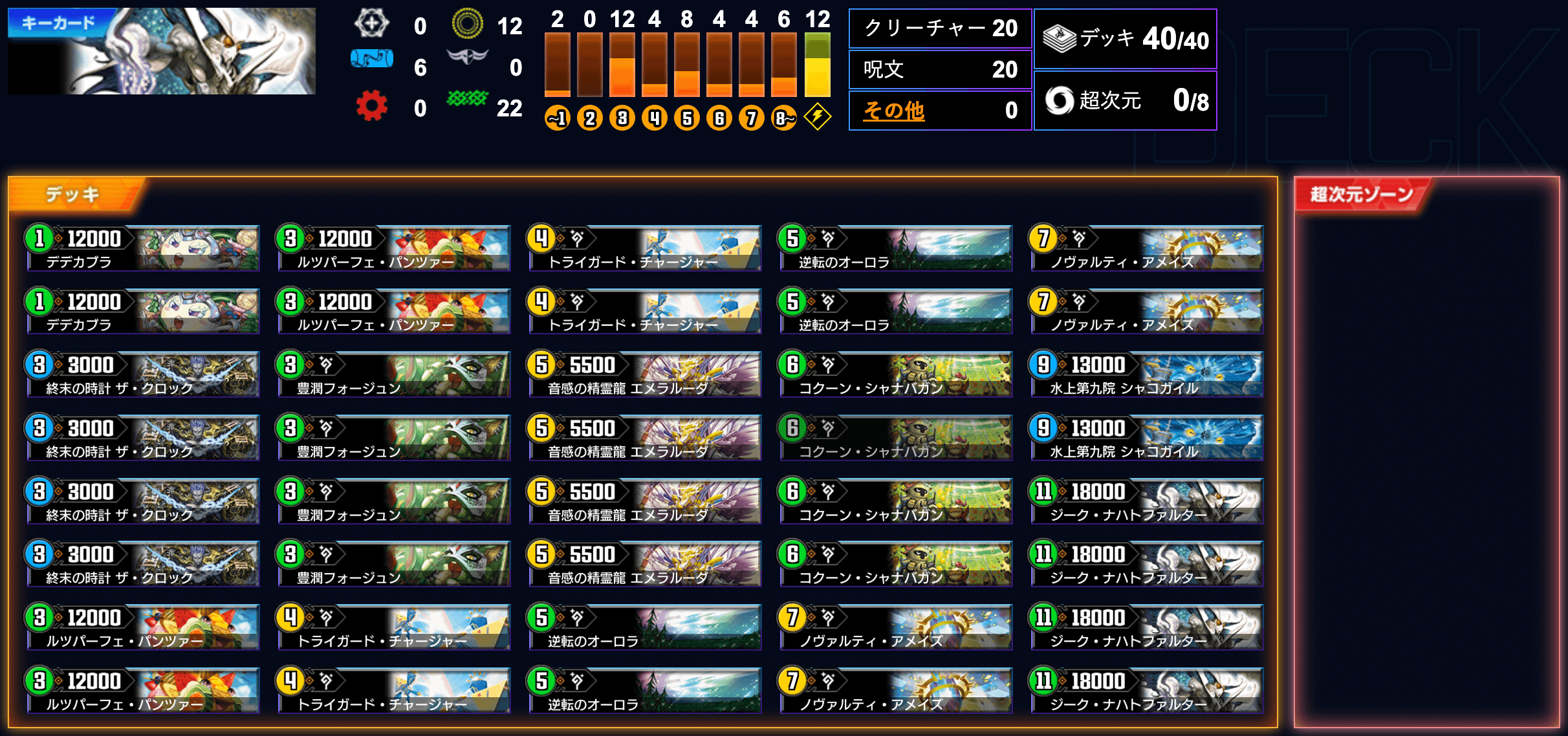 ループ手順 1 ジーク・ナハトファルター《ジーク・ナハトファルター》を召喚。効果でマナ加速しつつ、マナゾーンから《ルツパーフェ・パンツァー》を回収。2 ルツパーフェ・パンツァー回収した《ルツパーフェ・パンツァー》を召喚。マナ加速しつつ、自身の効果でマナゾーンに戻るため、再び《ジーク・ナハトファルター》の効果で《ルツパーフェ・パンツァー》を手札に戻す。3 ②を繰り返す。 4 水上第九院 シャコガイルマナが溜まった後は《シャコガイル》を回収して召喚。デッキの残り枚数が5枚以下になっていない場合は、再び②を繰り返す。デッキの残り枚数が5枚以下で相手ターンへ渡すと特殊勝利だ。コスト踏み倒し、もしくは直接の召喚で《ジーク・ナハトファルター》を展開。効果で《ルツパーフェ・パンツァー》をループさせ、《シャコガイル》によるEX勝利を狙う。