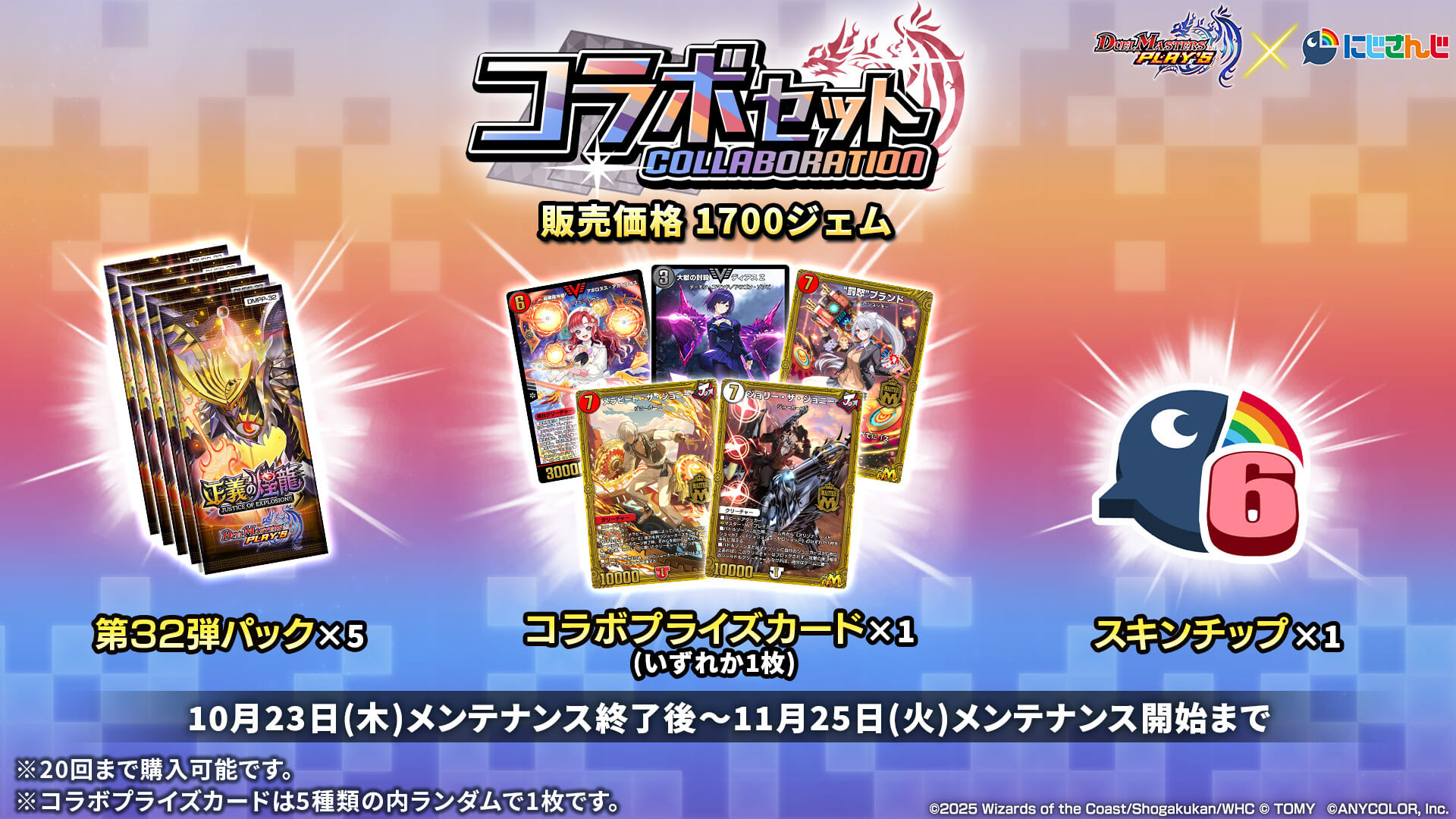 | セット内容 | ●第32弾パック×5 ●コラボカード×1 ┗ランダムに1枚 ●スキンチップ(第6弾Ver.)×1 ┗4枚で第6弾Ver.のコラボスキンと交換可能※4枚揃ったコラボPRカードは排出されないため、20セット購入でコラボカード全種×4枚コンプリート可能。 ※コラボカードは分解不可能。 |