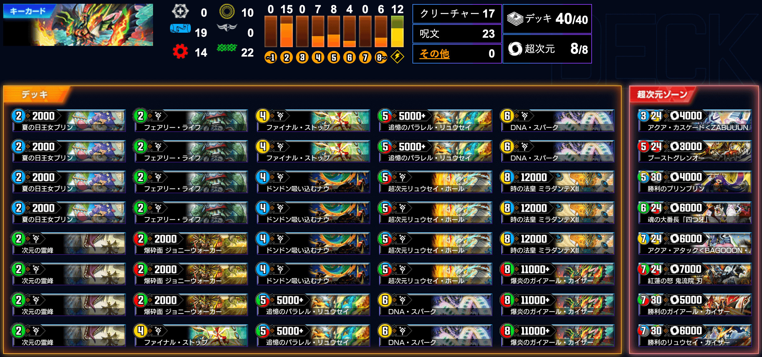 拡大中盤は《パラレル・リュウセイ》などを展開。マナ加速と手札リソースの獲得から、《爆炎のガイアール・カイザー》などのフィニッシャーを獲得していく。