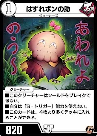 | ■シンパシー:《はずれポンの助》 ■W・ブレイカー ■バトルゾーンに出た時、バトルゾーンまたはすべてのマナゾーン、墓地にある《あたりポンの助》以外のクリー チャー1体を選ぶ。 ■選んだクリーチャーと同じ名前のクリーチャーと《はずれポンの助》に書かれた能力をすべて無視する。 |