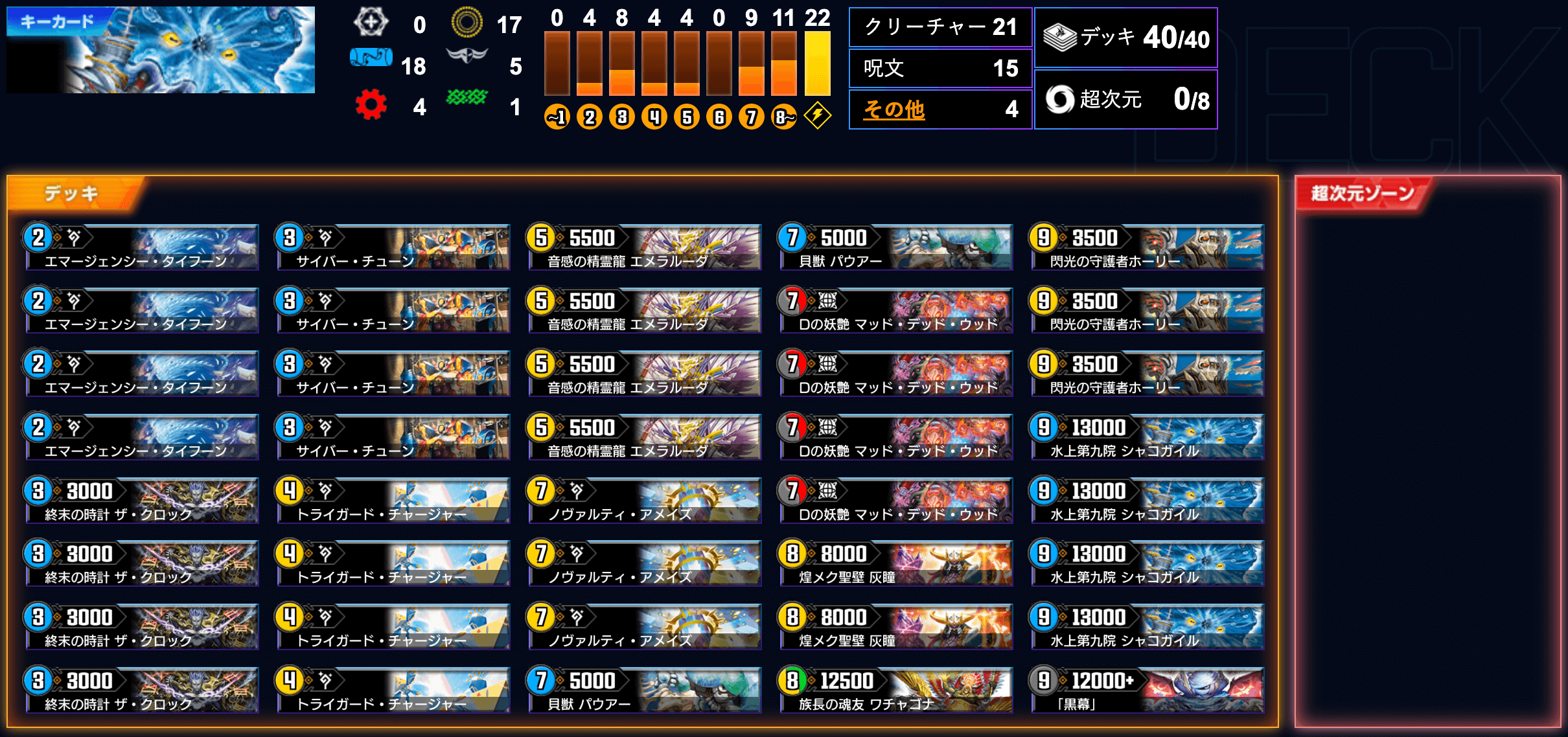 「光水MDWシャコ」は、《Dの妖艶 マッド・デッド・ウッド》から《シャコガイル》《エンド・オブ・ザ・ワールド》を同時展開し、ワンショットコンボを決めるデッキの一種だ。耐久面は《トライガード・チャージャー》《エメラルーダ》といったシールド操作系のカードを多数採用し、S・トリガーによる高い防御性能を確保している。