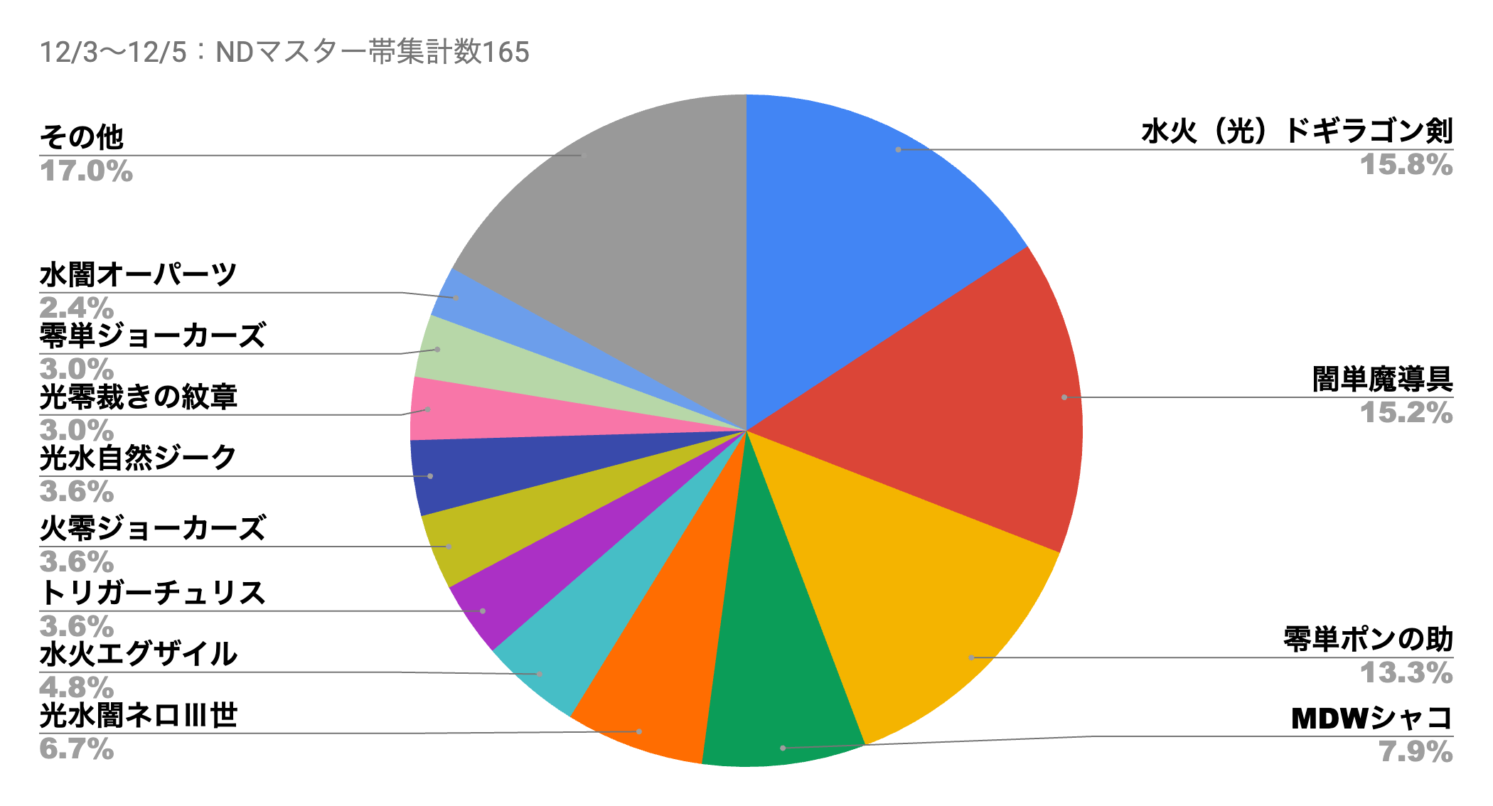 まず、今週のND対戦環境では何が起こっていたかというと、(おそらく)世間一般の事前評価ではネタ、地雷枠扱いをされていた「零単ポンの助」が予想だにしない暴れ方をした、かつ、想定通り《"龍装"チュリス》の追加で強化された「ドギラゴン剣」が暴れた影響で、「トリガーサッヴァーク」「トリガーチュリス」といった耐久性能に特化したデッキが流行。さらには「零単ポンの助」などをある程度見つつ、「零単ポンの助」を対策した耐久系のデッキを打破できる「MDWシャコ」「光水自然ジーク」といったコンボ耐久系のデッキが流行し、環境の鈍化が週初までの環境の流れとなっている。