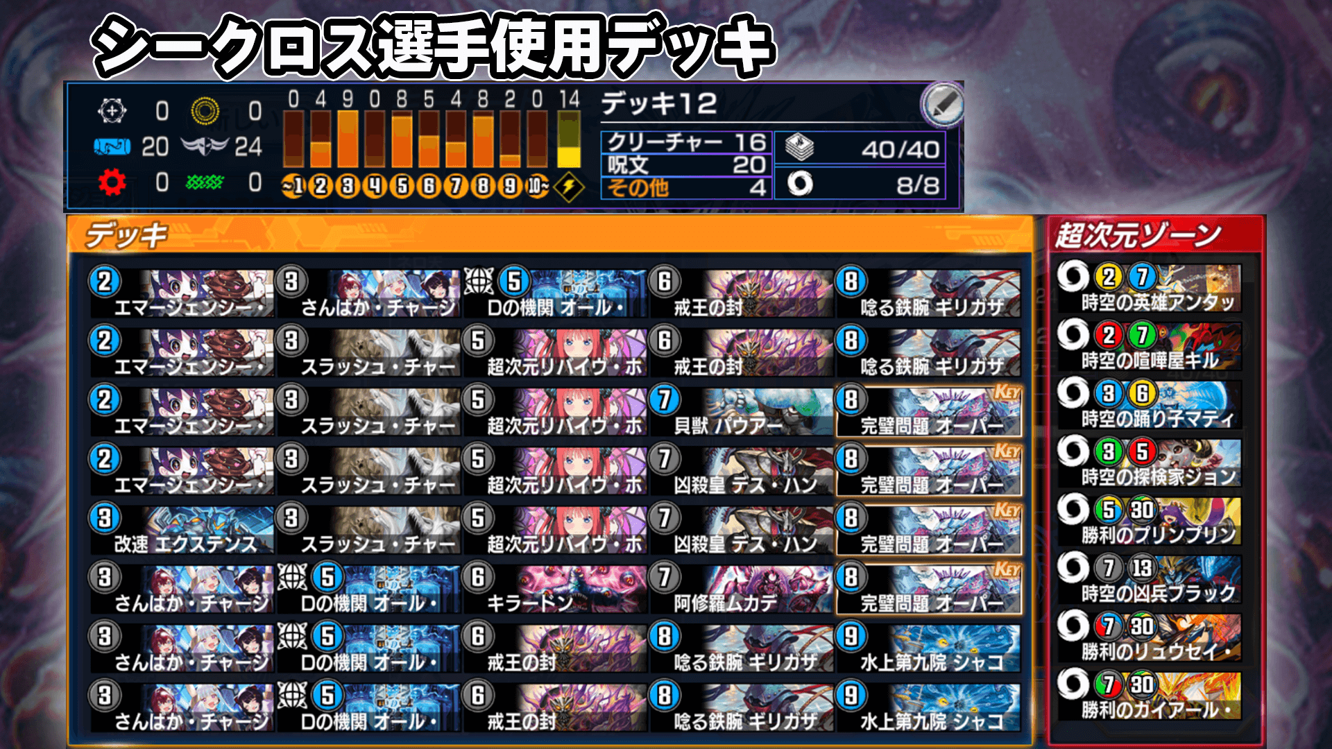 | 特に警戒したデッキは《煌龍 サッヴァーク》のデッキですね。あのカードが《Dの機関 オール・フォー・ワン》を盾に埋めてきたりして。水闇オーパーツは盾に埋められたカードを回収する手段に乏しい関係上かなり警戒していました。 |