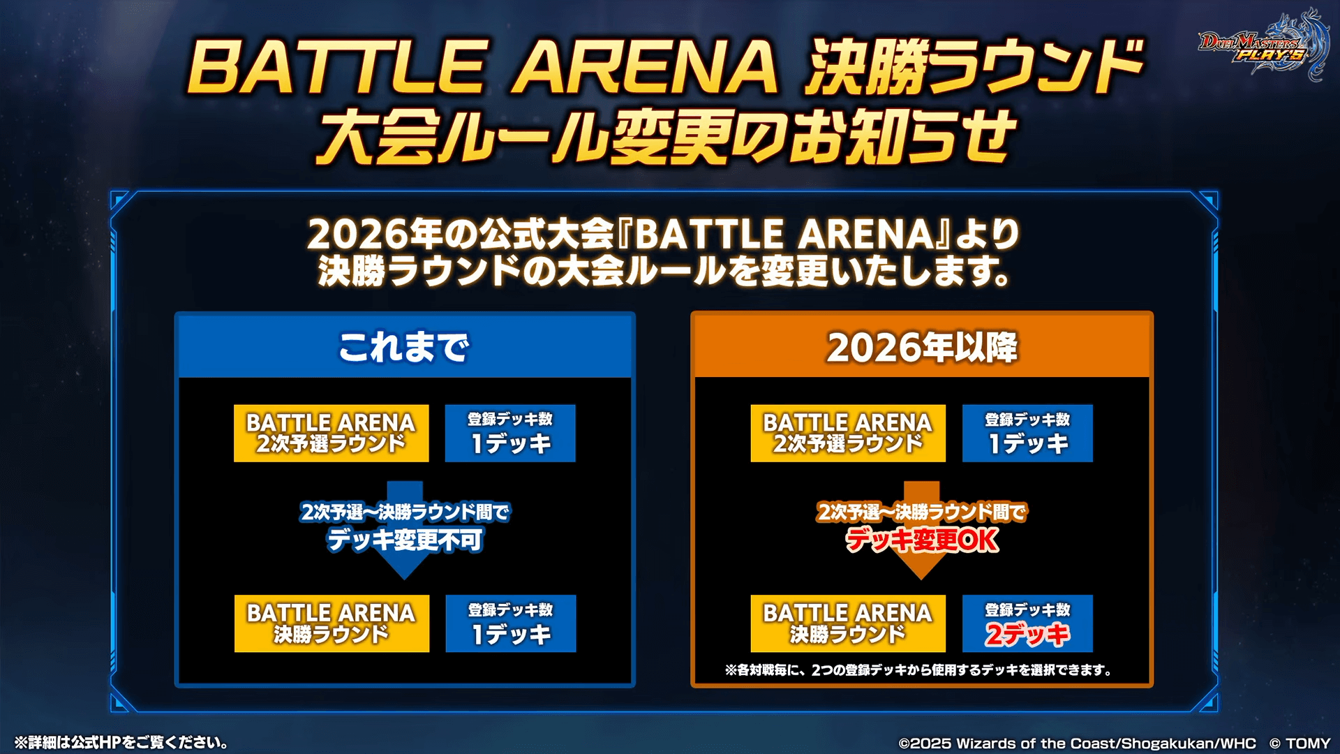 ①二次予選ラウンドと決勝ラウンド間でデッキ変更が可能に。②決勝ラウンドでは2デッキまで登録可能に |