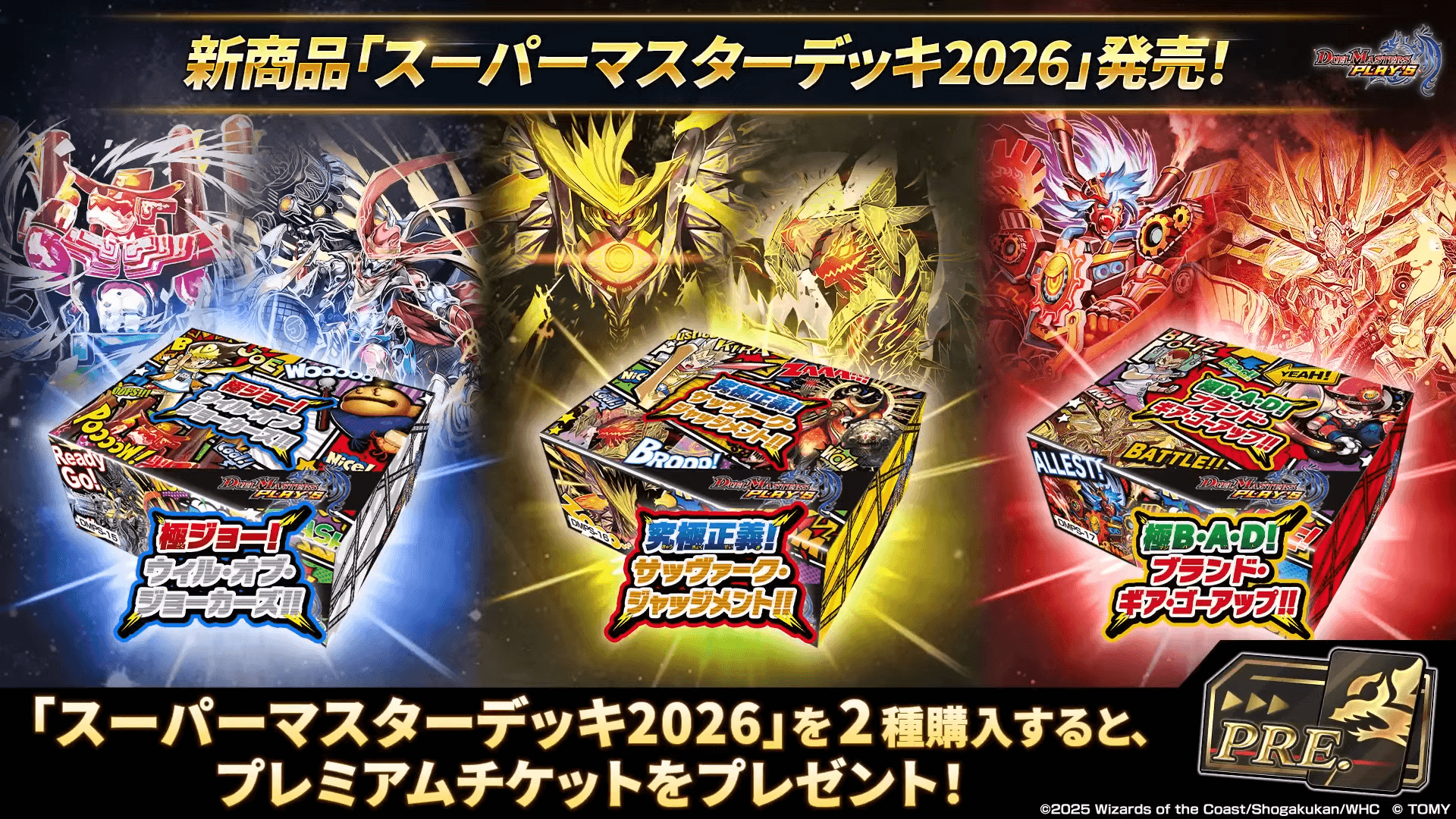 『デュエプレ(デュエマプレイス)』のスーパーマスターデッキ2026(構築済デッキ)のカード内容と入手方法について掲載。リリース日や、どちらのデッキを購入するべきかについても解説しているため、どのデッキを獲得するか迷っている方はぜひ参考にどうぞ。