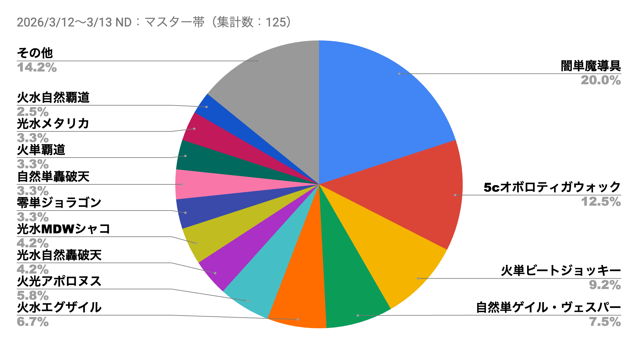 使用率下位の方では「光水MDWシャコ」「火光アポロヌス」の使用率の上昇に注目。「光水MDWシャコ」は高い耐久性によるビートデッキへの有利かつ、「闇単魔導具」に対しても有利。「火光アポロヌス」は、《クラッシュ”覇道”》を警戒して単体除去トリガーを積んだデッキが増えているため、《アポロヌス・アガペリオス》によるワンショットが刺さりやすくなっているといった特徴をち、いずれも上位デッキに対するカウンターが意識された結果上昇してきたデッキ達だ。