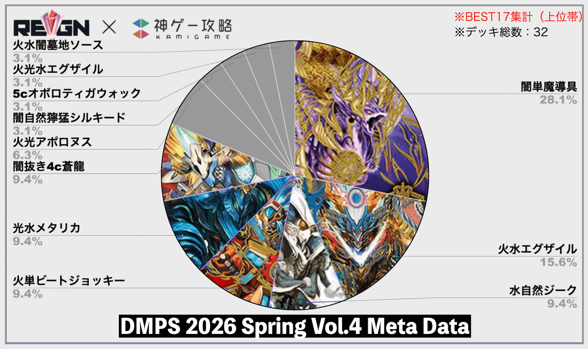新弾の目玉デッキの一つ「ジョラゴン」は初日こそ流行したものの、次第に《G・W・D》「闇単魔導具」「覇道」といった盤面処理性能が高いデッキに封殺され、急激に数が減少。もう片方の目玉デッキ「オウ禍武斗」も、「ジークループ」と役割が被り、かつ「ジークループ」の方がハンデスに耐性があるなどの理由から数が少ない。