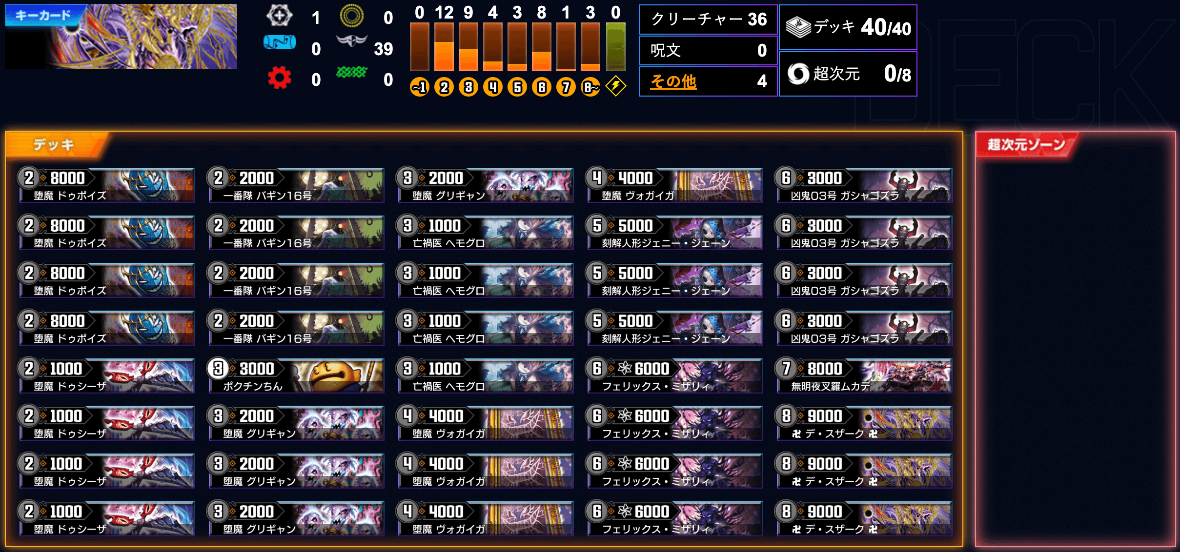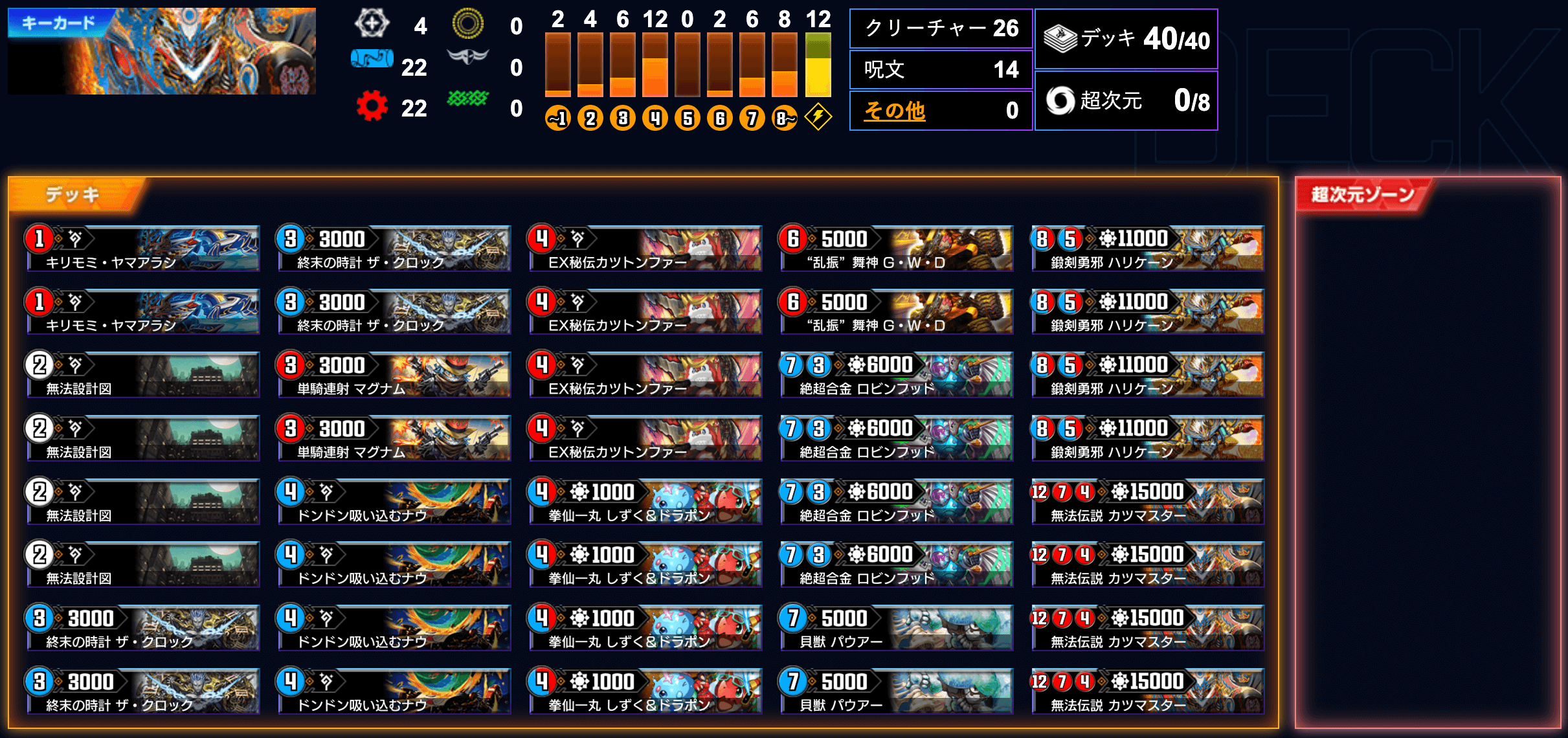 | 唯一新カードとしては、デッキの長所をさらに伸ばす役割を持つ《無明夜叉羅ムカデ》序盤のリソースを安定化させる《堕魔 ドゥンブレ》速攻ビートや無月の門発動をサポートする《堕魔 ザンバリー》などが1〜2枚程度個々人で入れ替え |