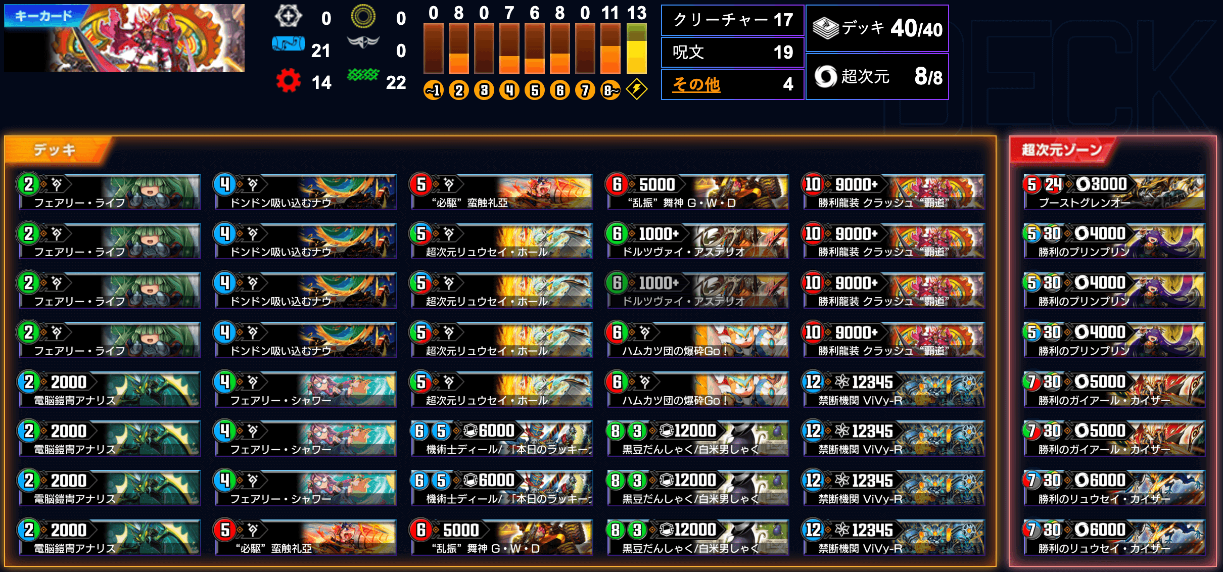 | 《リュウセイ・ホール》などの火水自然カラーを軸にしたビッグマナ、グッドスタッフ構築にすることで、《クラッシュ"覇道"》と《ViVy-R》の両カードパワーを存分に発揮できるため、「覇道」デッキの中では最も高い使用率を誇る |