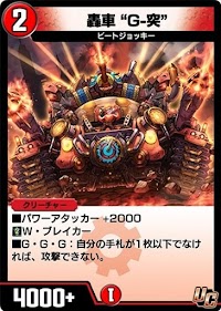 | ■パワーアタッカー+2000 ■W・ブレイカー ■G・G・G:自分の手札が1枚以下でなければ、攻撃できない。 |