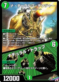 | ■マッハファイター ■T・ブレイカー ■バトルゾーンに出た時、または自分が名前に《トラップ》とある呪文を唱えた時、自分の手札またはマナゾーンから、自然のコスト6以下のクリーチャー1枚をバトルゾーンに出してもよい。■S・トリガー ■相手のクリーチャー1体をマナゾーンに置く。 |
