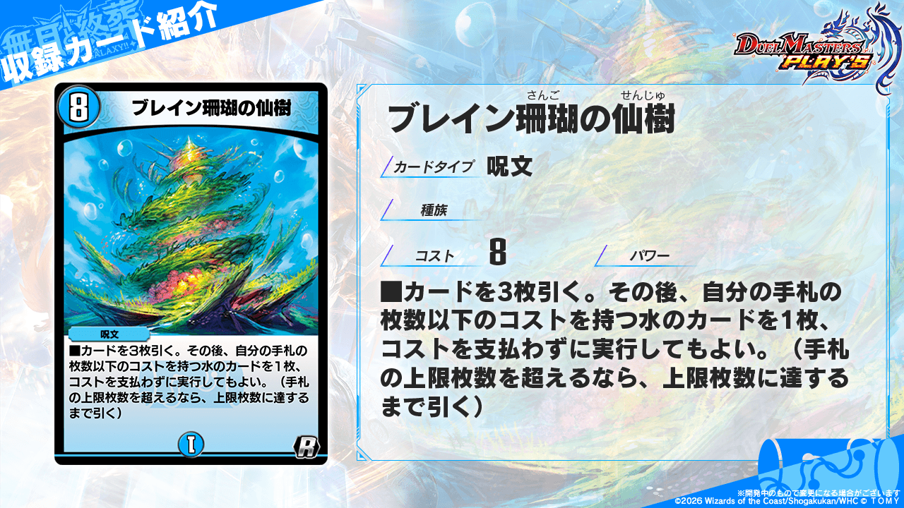 《ブレイン珊瑚の仙樹》は、3枚ドロー後、自分の手札枚数以下の水文明のカードを踏み倒せる大型呪文だ。デュエプレの手札上限は10枚であるため、最大10コストの水文明のカードを踏み倒せる。また、踏み倒し対象のカードタイプに制限はないため、進化を含めたクリーチャー、呪文、D2フィールドetc...といった幅広いカードを踏み倒せる。