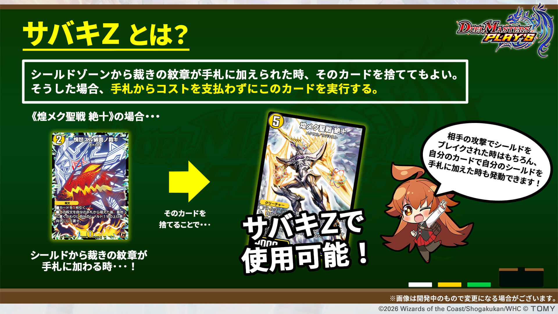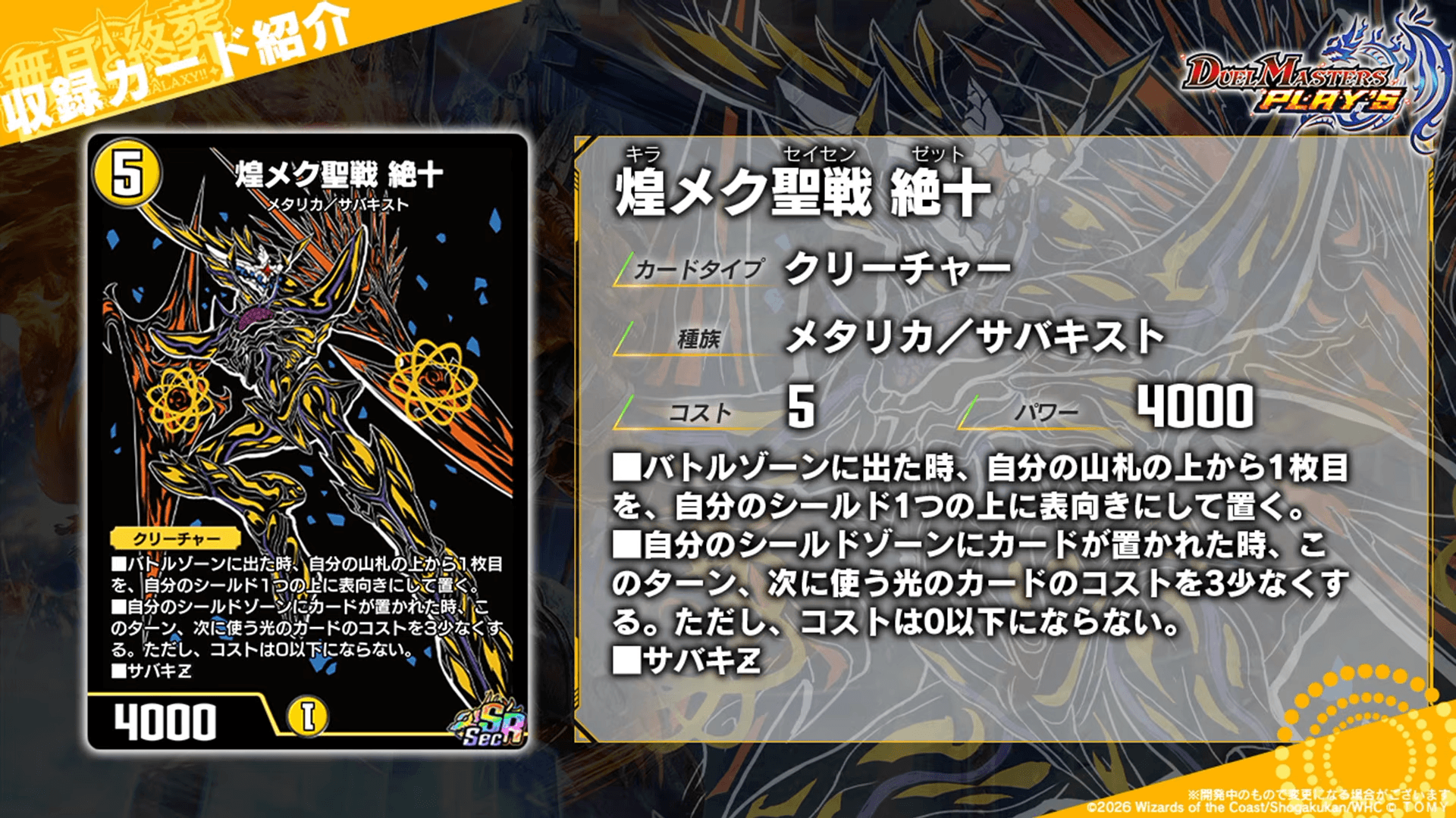 レアリティ:VRカードタイプ:クリーチャーコスト:9パワー:10500文明:光種族:メタリカサバキスト効果テキスト|画像拡大 |