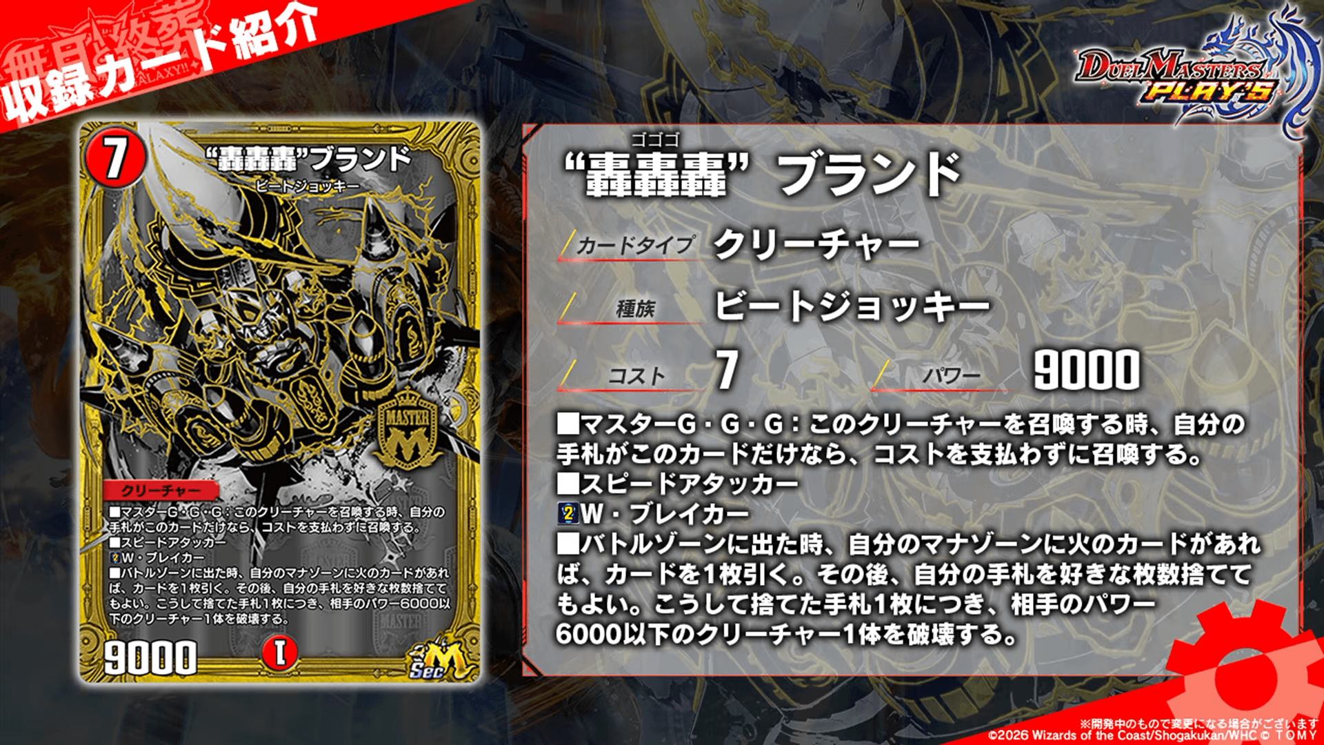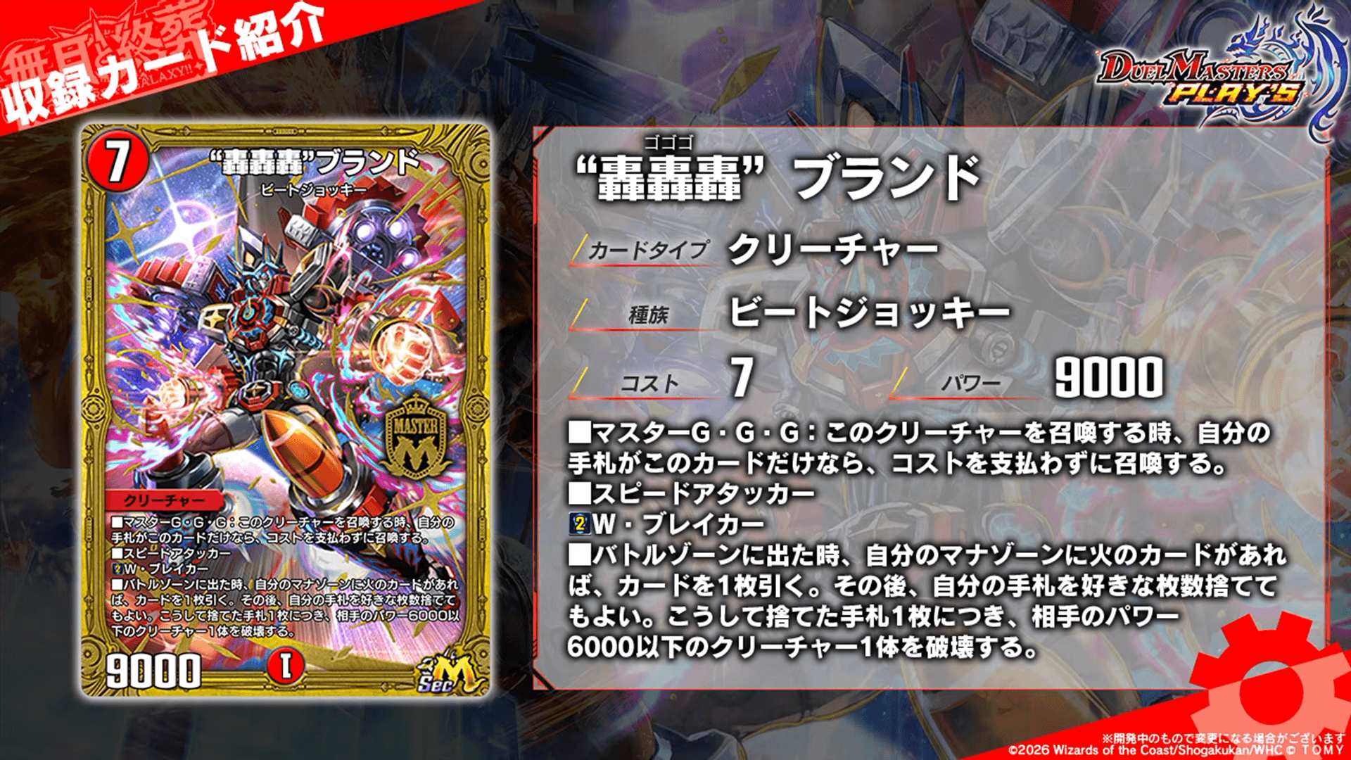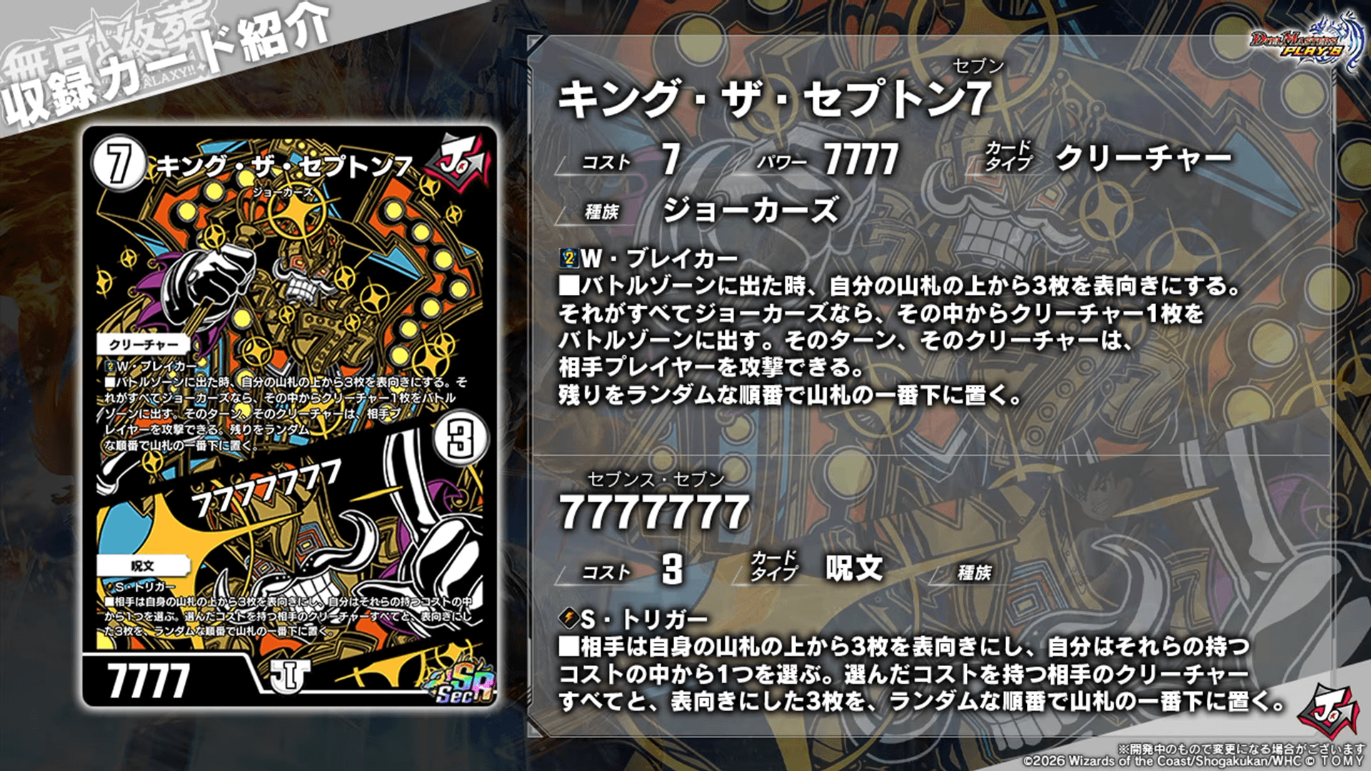 レアリティ:SRカードタイプ:クリーチャー/呪文コスト:7/3パワー:7777/-文明:零種族:ジョーカーズ-効果テキスト|画像拡大 |