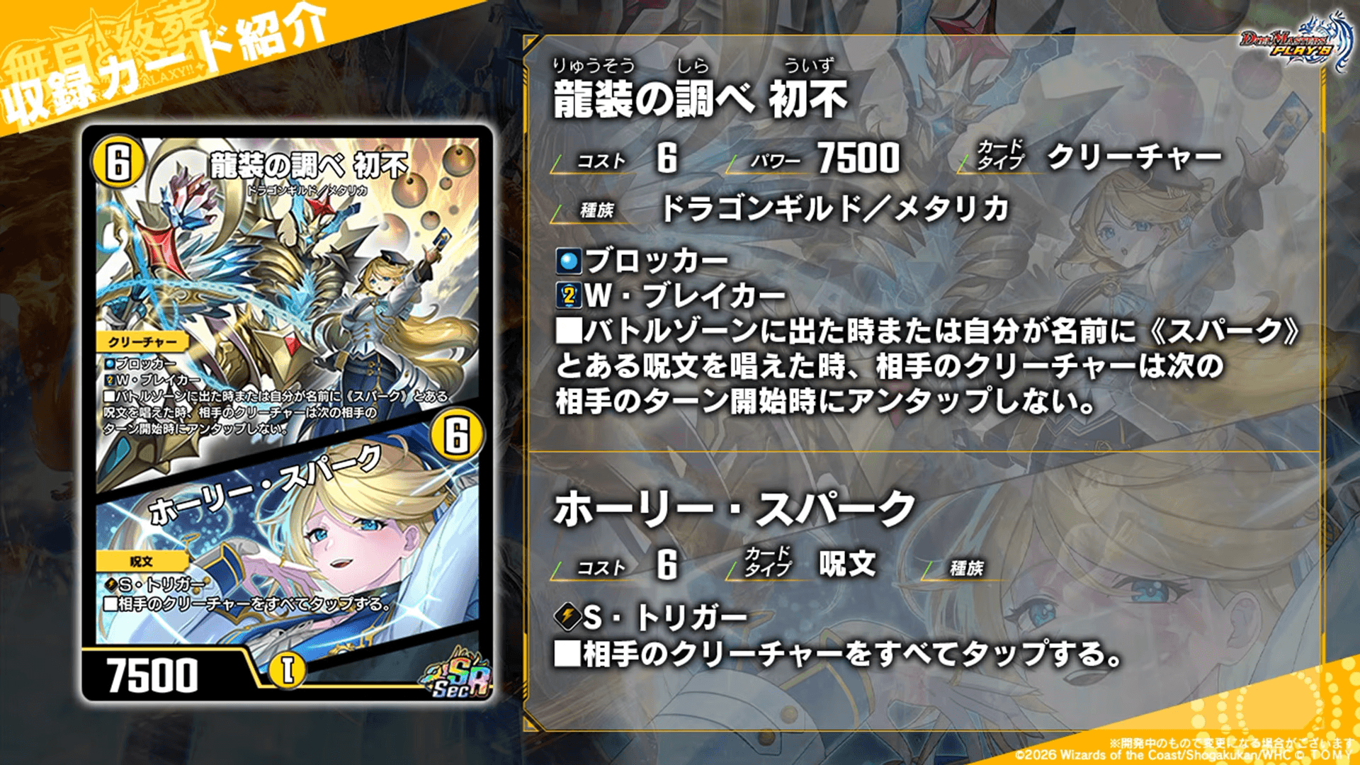 レアリティ:Rカードタイプ:クリーチャーコスト:7パワー:7500文明:光種族:マスター・ドラゴンメタリカ効果テキスト|画像拡大 |