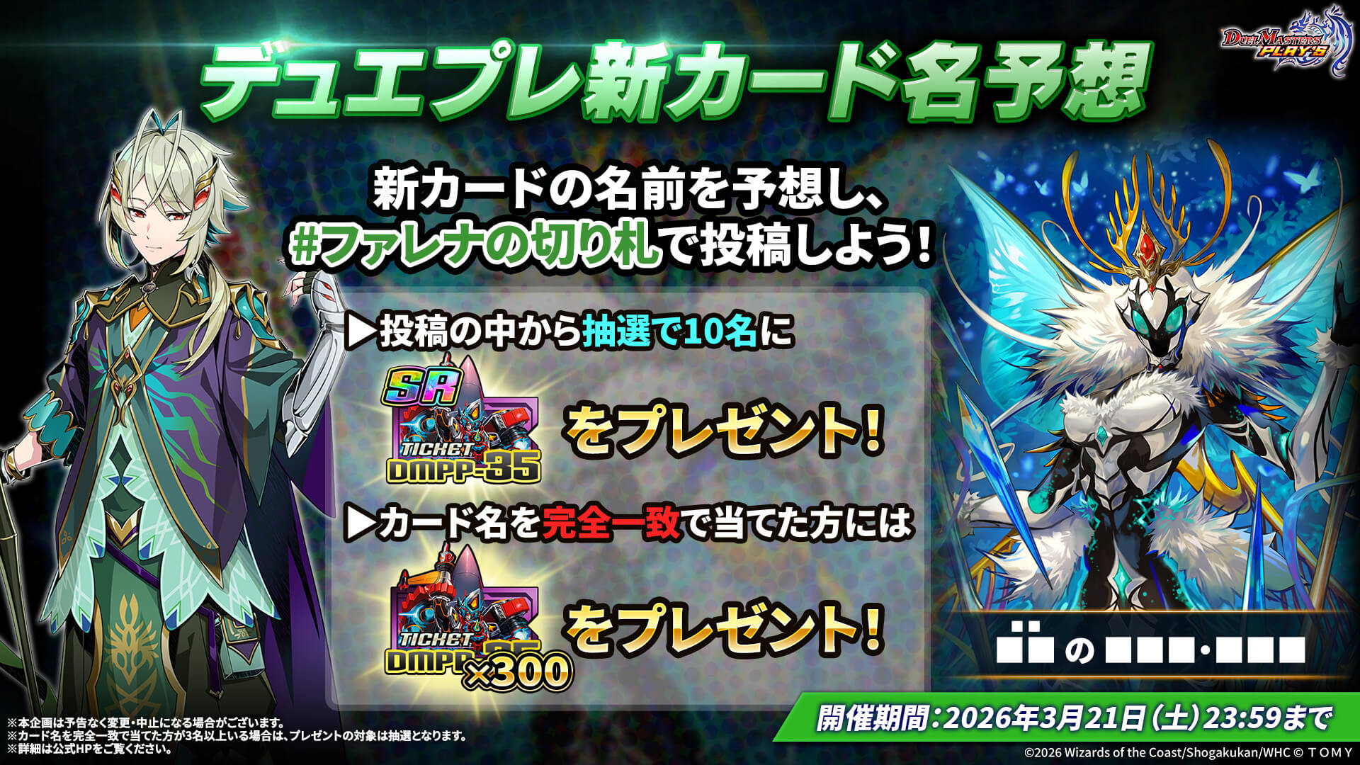 | イベント内容 | 新カードの名前を予想し、「」をつけて𝕏で投稿すると、投稿の中から抽選で10名様に第35弾SRチケットをプレゼント。カード名を完全一致で当てた方には第35弾パックチケット×300をプレゼント。 |